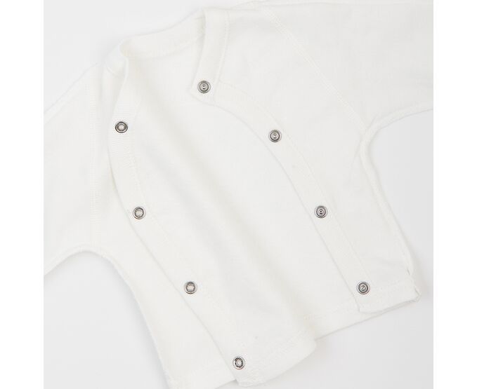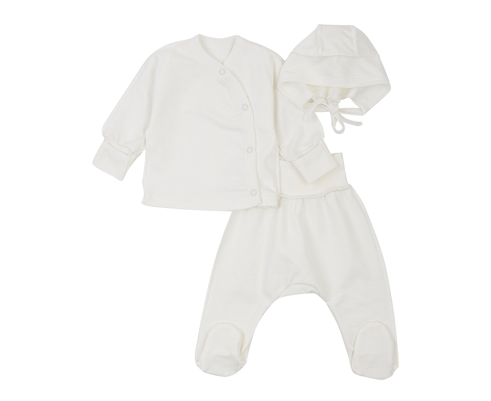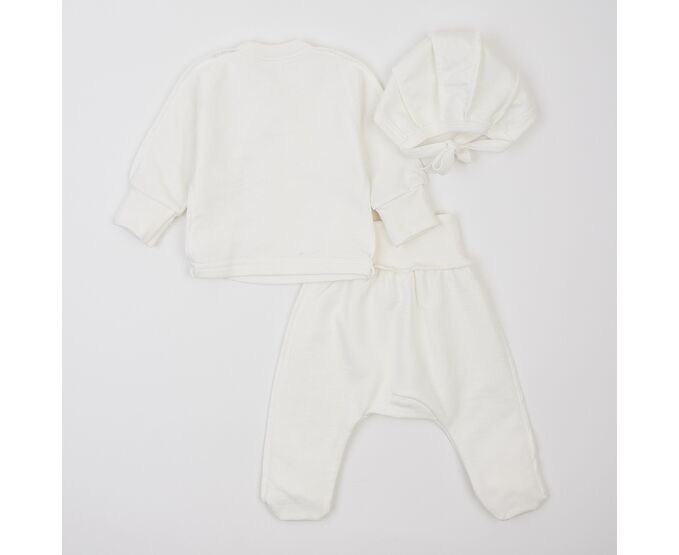 Тепленький комплект для новонароджених з м'якого, приємного на дотик футеру з начосом. Складається з льолі, повзунків та чепчику. Льоля з асиметричною застібкою на кнопки на запах. Рукав реглан, манжети льолі з еластичної рібани та з відворотом, що дозволяє перетворити їх в царапки. Повзунки з ластовицею, без середніх швів, з поясом з еластичної рібани. Чепчик із зав'язками під підборіддям. Модель чепчику з чотирьох деталей, що забезпечує щільність прилягання виробу. Натуральний склад полотна та шви назовні в усіх виробах комплекту, які не торкаються шкіри малюка, виключають будь-який дискомфорт та подразнення.