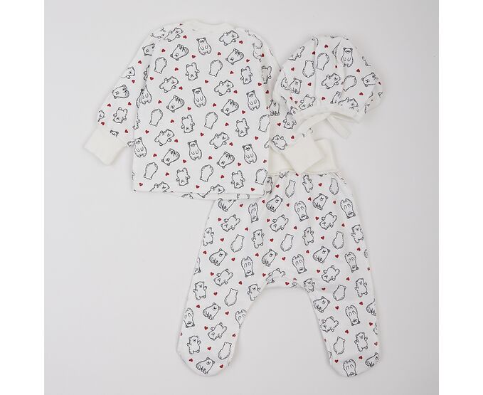 Тепленький комплект для новонароджених з м'якого, приємного на дотик футеру з начосом. Складається з льолі, повзунків та чепчику. Льоля з асиметричною застібкою на кнопки на запах. Рукав реглан, манжети льолі з еластичної рібани та з відворотом, що дозволяє перетворити їх в царапки. Повзунки з ластовицею, без середніх швів, з поясом з еластичної рібани. Чепчик із зав'язками під підборіддям. Модель чепчику з чотирьох деталей, що забезпечує щільність прилягання виробу. Натуральний склад полотна та шви назовні в усіх виробах комплекту, які не торкаються шкіри малюка, виключають будь-який дискомфорт та подразнення.