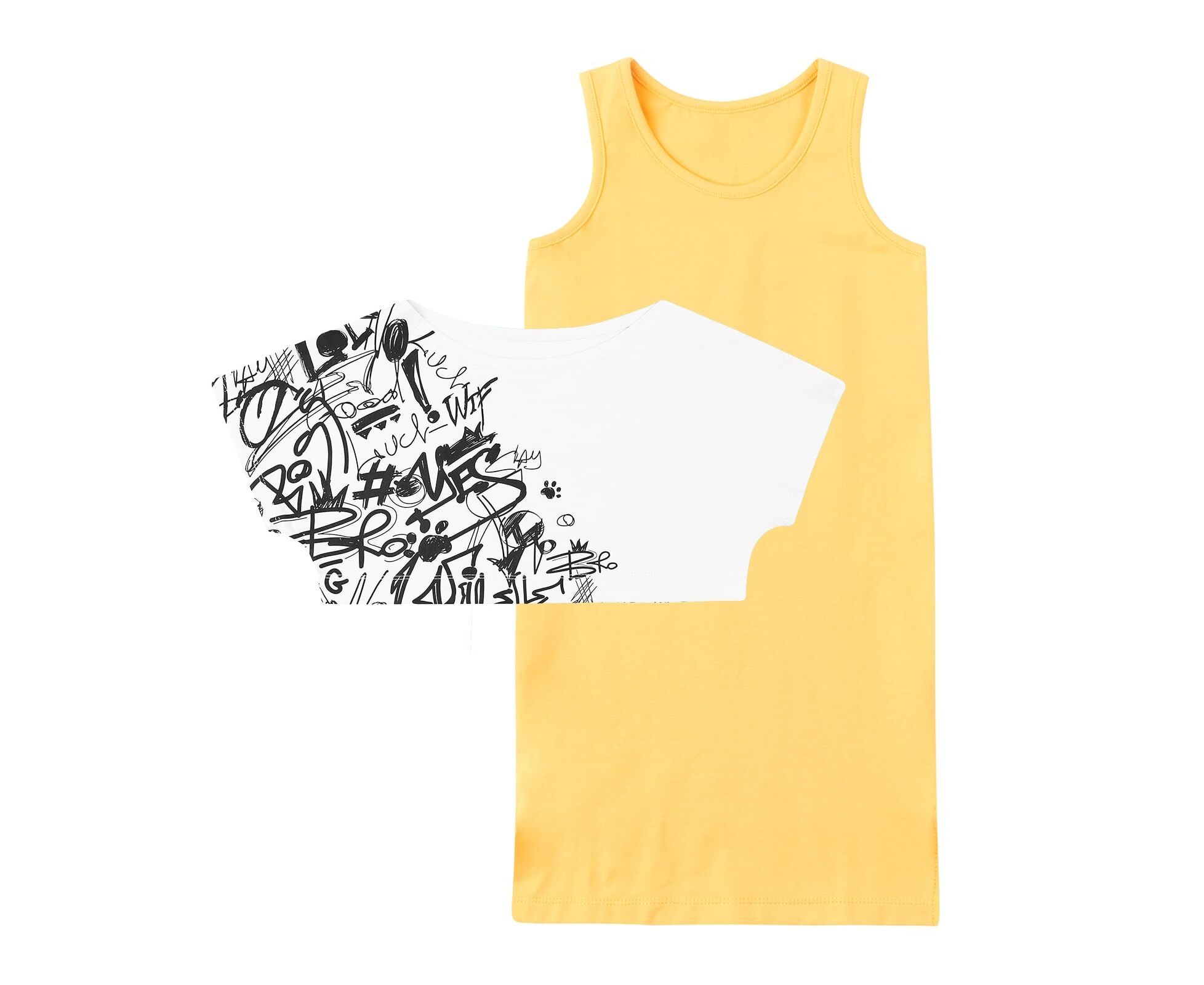 Комплект для дівчинки, з стрейч-кулірової туніки-майки та короткої накидки з стрейч-куліру контрасного кольору. Туніка силуету трапеція, з маленьким принтом на спинці, горловина та пройми окантовані руликом. Накидка вільного широкого крою, з горловиною лодочкою, цільнокроєним рукавом та стильним принтом на переді та спинці.