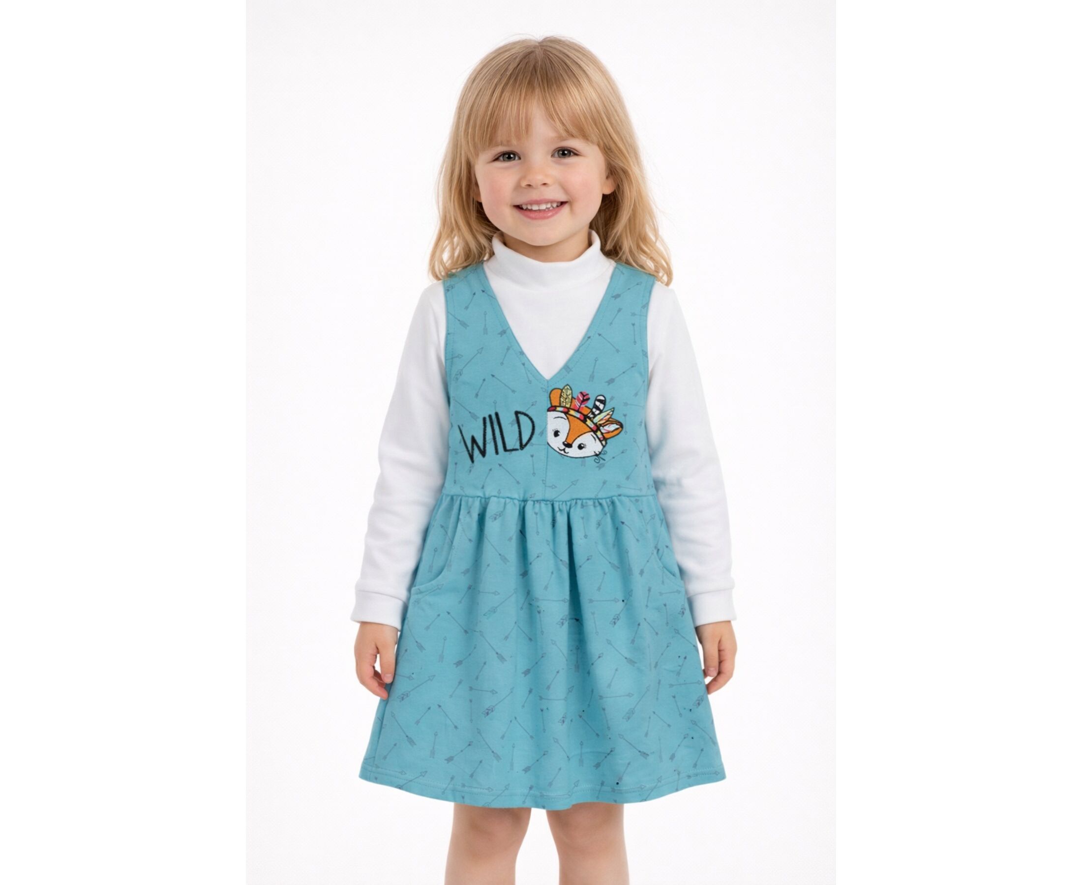 Дитячий костюмчик з сарафану та гольфу. Сарафан з темно-синьої якісної двонитки, яка добре тримає форму навіть після багаторазового прання. На переді маленька світловідбивна наліпка. Сарафан з з еластичною призборкою по лінії таліі, з боковими кишенями на спідниці переда. Горловина та пройми оброблені лампасом з внутрішнього боку. Гольф-водолазка виготовлена з еластичної, м'якенької, дуже приємної на дотик, рібани преміум якості. Висока горловина дозволяє регулювати ширину відвороту як зручніше буде дитині. До 104-го розміру по горловині плечова застібка на кнопки для полегшення надягання, щоб малюк не вередував при продіванні голови. По низу рукавів манжети, що забезпечує щільне прилягання виробу. Низ виробу прямий.