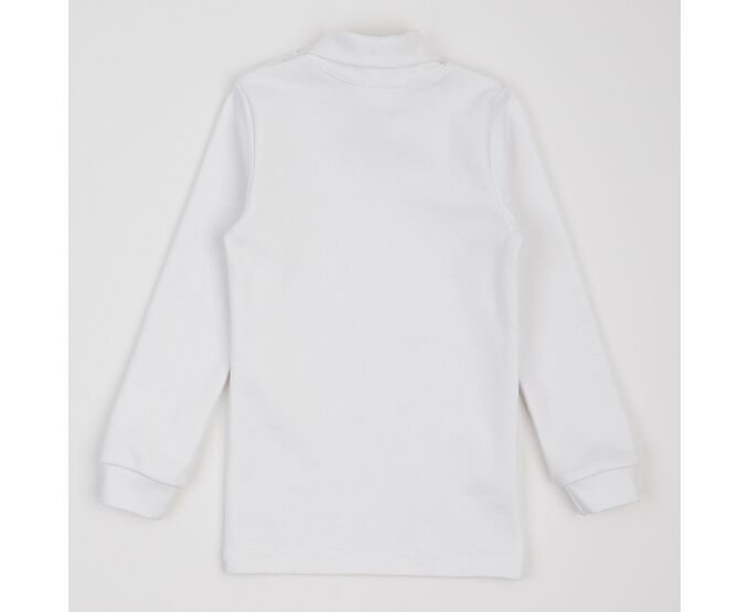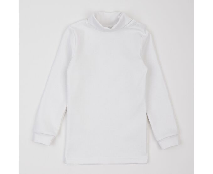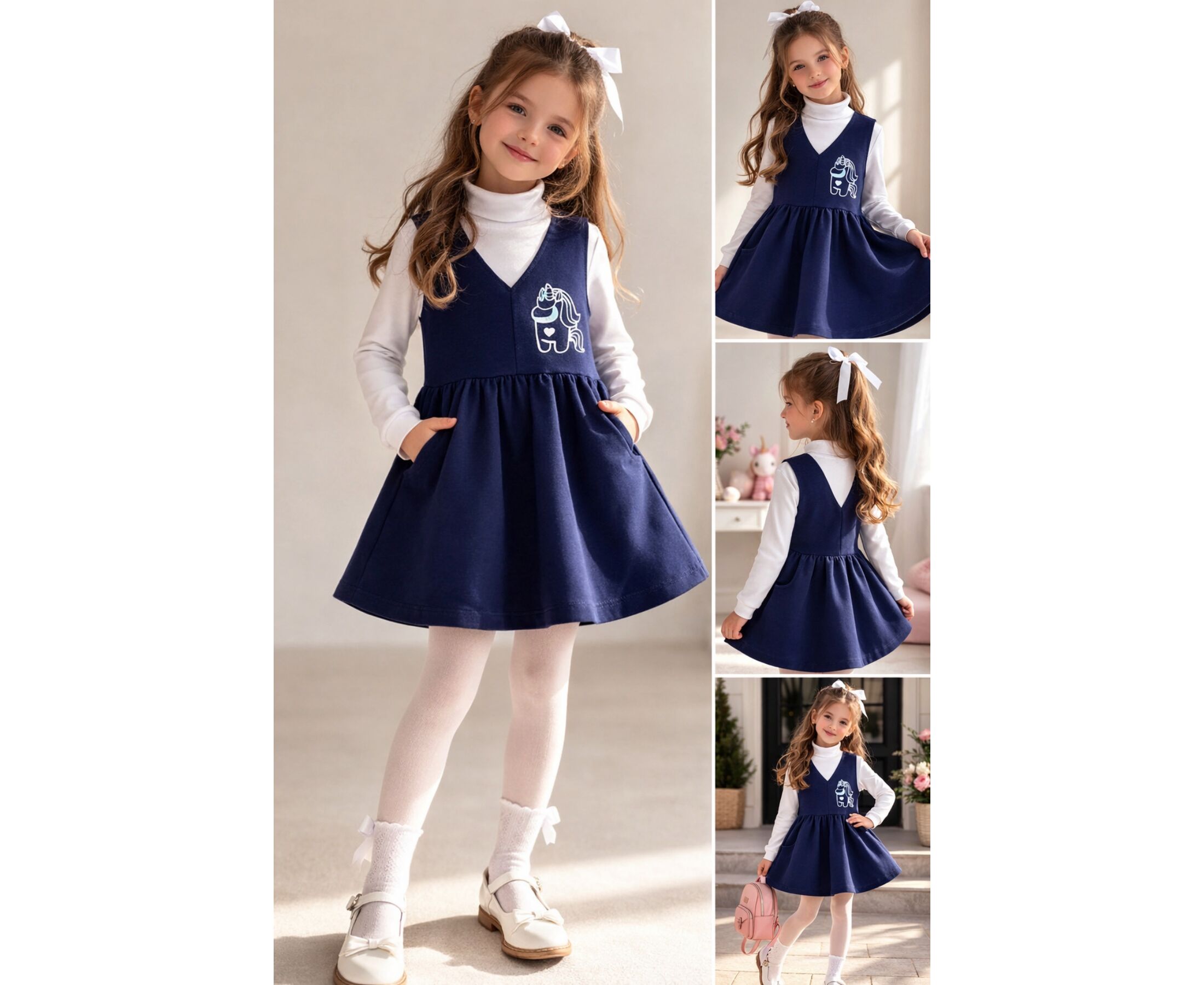 Дитячий костюмчик з сарафану та гольфу. Сарафан з темно-синьої якісної двонитки, яка добре тримає форму навіть після багаторазового прання. На переді маленька світловідбивна наліпка. Сарафан з з еластичною призборкою по лінії таліі, з боковими кишенями на спідниці переда. Горловина та пройми оброблені лампасом з внутрішнього боку. Гольф-водолазка виготовлена з еластичної, м'якенької, дуже приємної на дотик, рібани преміум якості. Висока горловина дозволяє регулювати ширину відвороту як зручніше буде дитині. До 104-го розміру по горловині плечова застібка на кнопки для полегшення надягання, щоб малюк не вередував при продіванні голови. По низу рукавів манжети, що забезпечує щільне прилягання виробу. Низ виробу прямий.