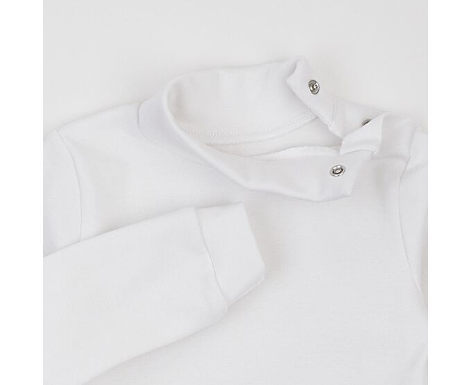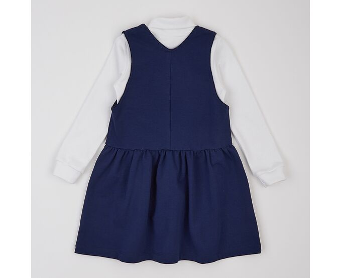 Дитячий костюмчик з сарафану та гольфу. Сарафан з темно-синьої якісної двонитки, яка добре тримає форму навіть після багаторазового прання. На переді маленька світловідбивна наліпка. Сарафан з з еластичною призборкою по лінії таліі, з боковими кишенями на спідниці переда. Горловина та пройми оброблені лампасом з внутрішнього боку. Гольф-водолазка виготовлена з еластичної, м'якенької, дуже приємної на дотик, рібани преміум якості. Висока горловина дозволяє регулювати ширину відвороту як зручніше буде дитині. До 104-го розміру по горловині плечова застібка на кнопки для полегшення надягання, щоб малюк не вередував при продіванні голови. По низу рукавів манжети, що забезпечує щільне прилягання виробу. Низ виробу прямий.