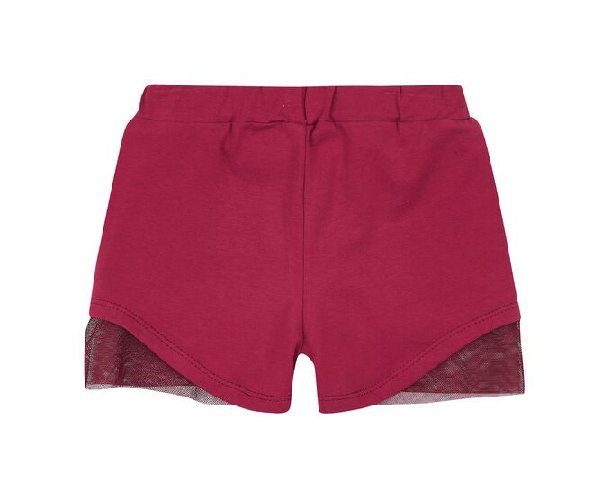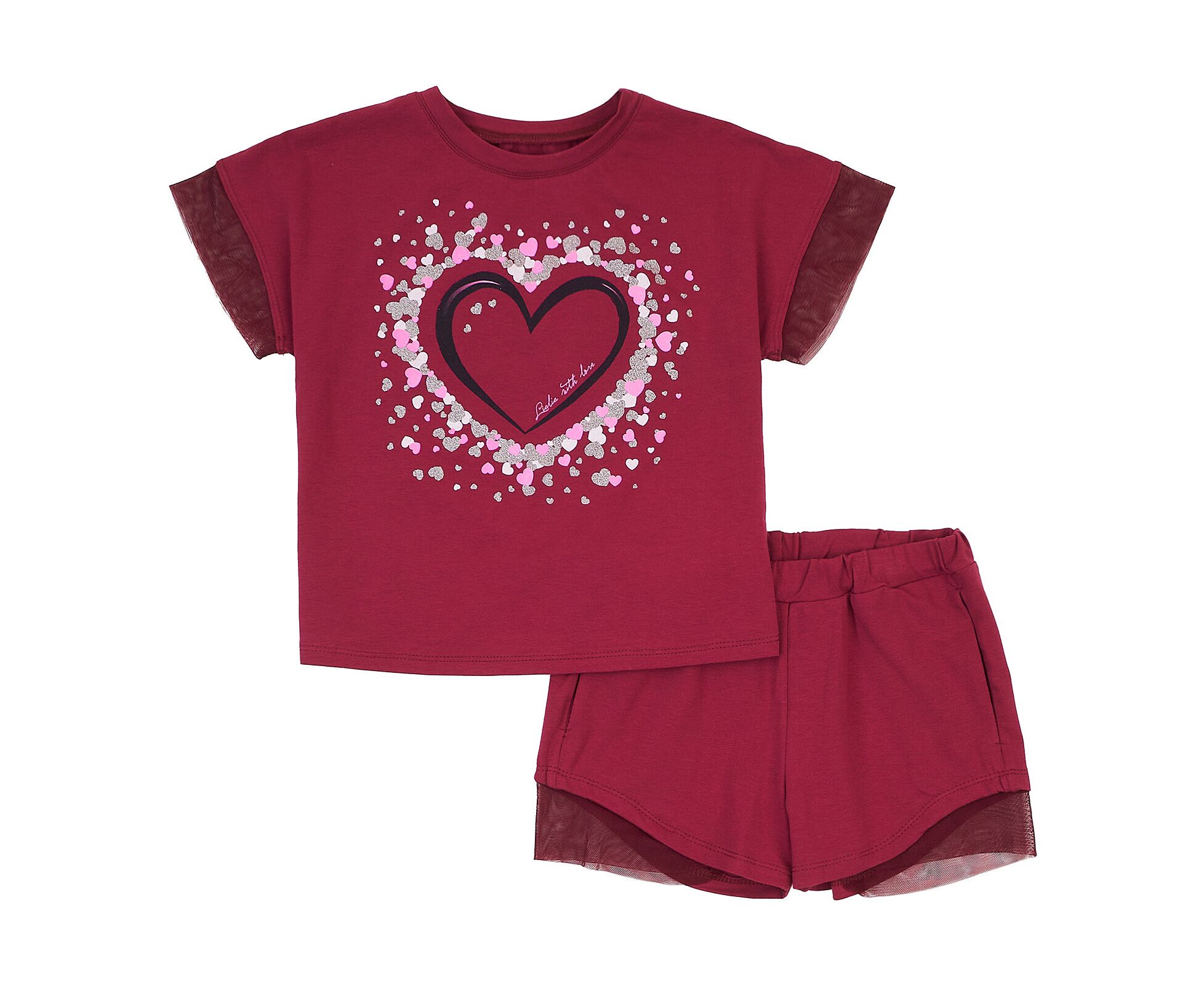 Літній комплект для дівчинки, з футболки та шорт, з якісного стрейч-куліру, який добре тримає колір та форму навіть після багаторазового прання. Футболка зі стильним принтом з блискучими елементами на переді , з спущеним плечем та рукавом-рюшею з м'якої еластичної євросітки. Шорти з притачним поясом з резинкою, з боковими кишенями, з фігурною лінією низу, оздобленою декоративними деталями з приємної м'якої еластичної євросітки.