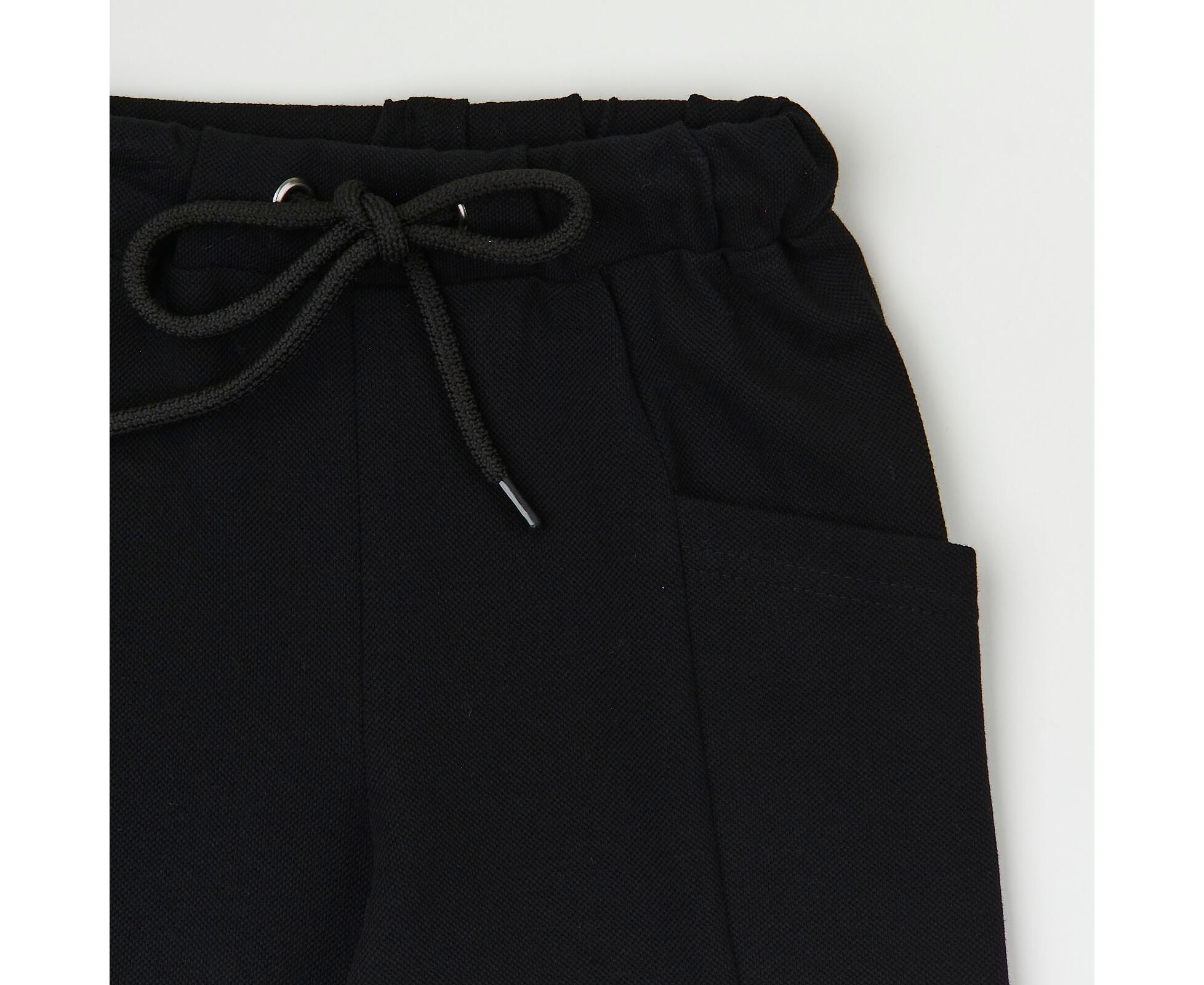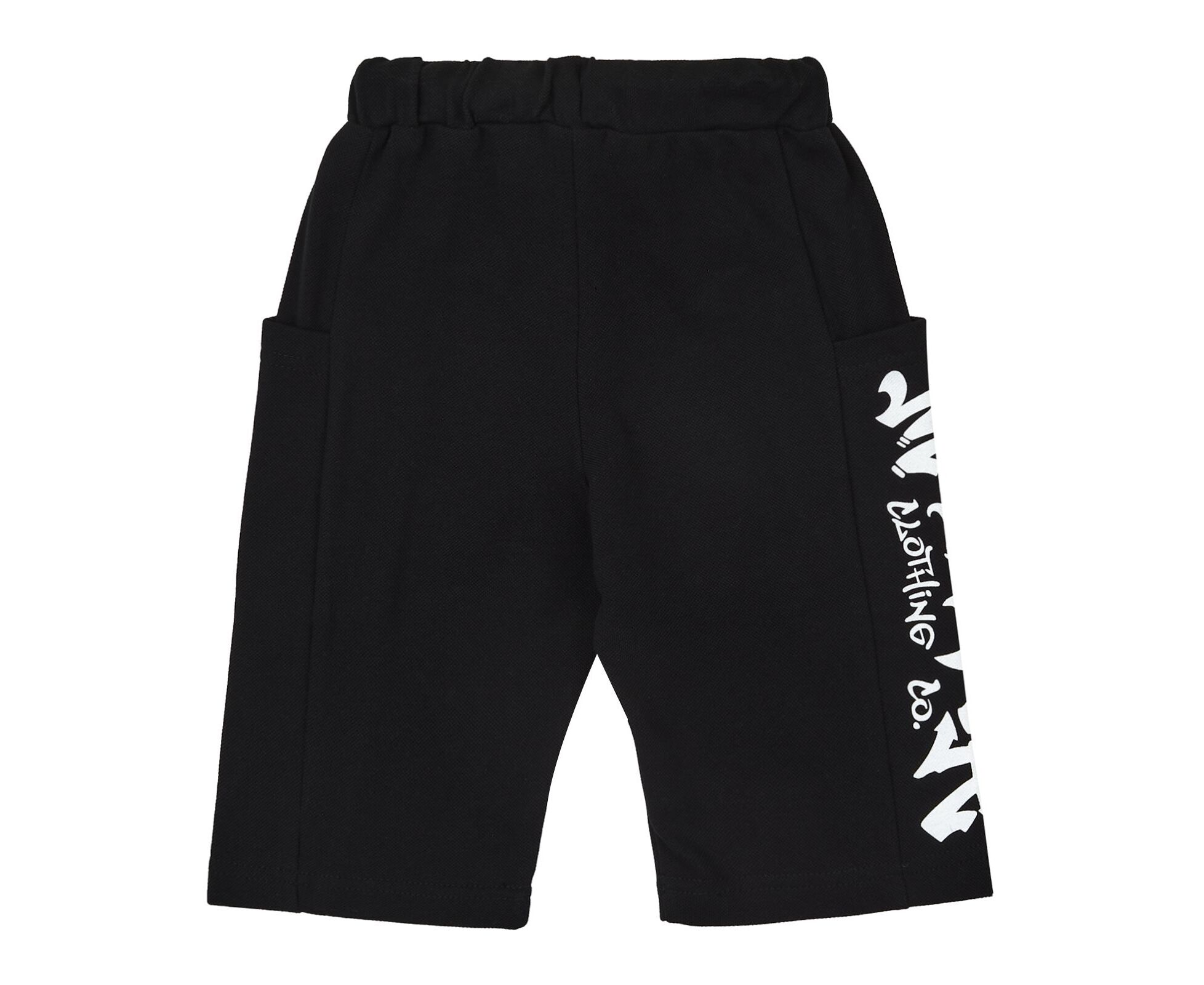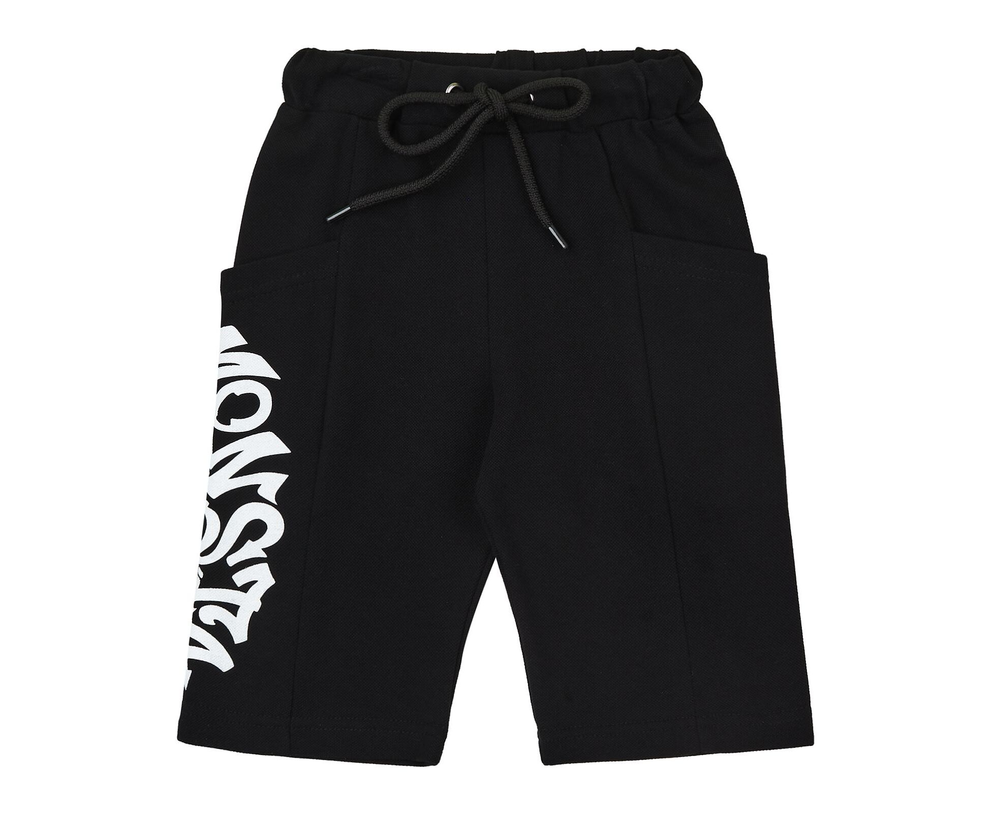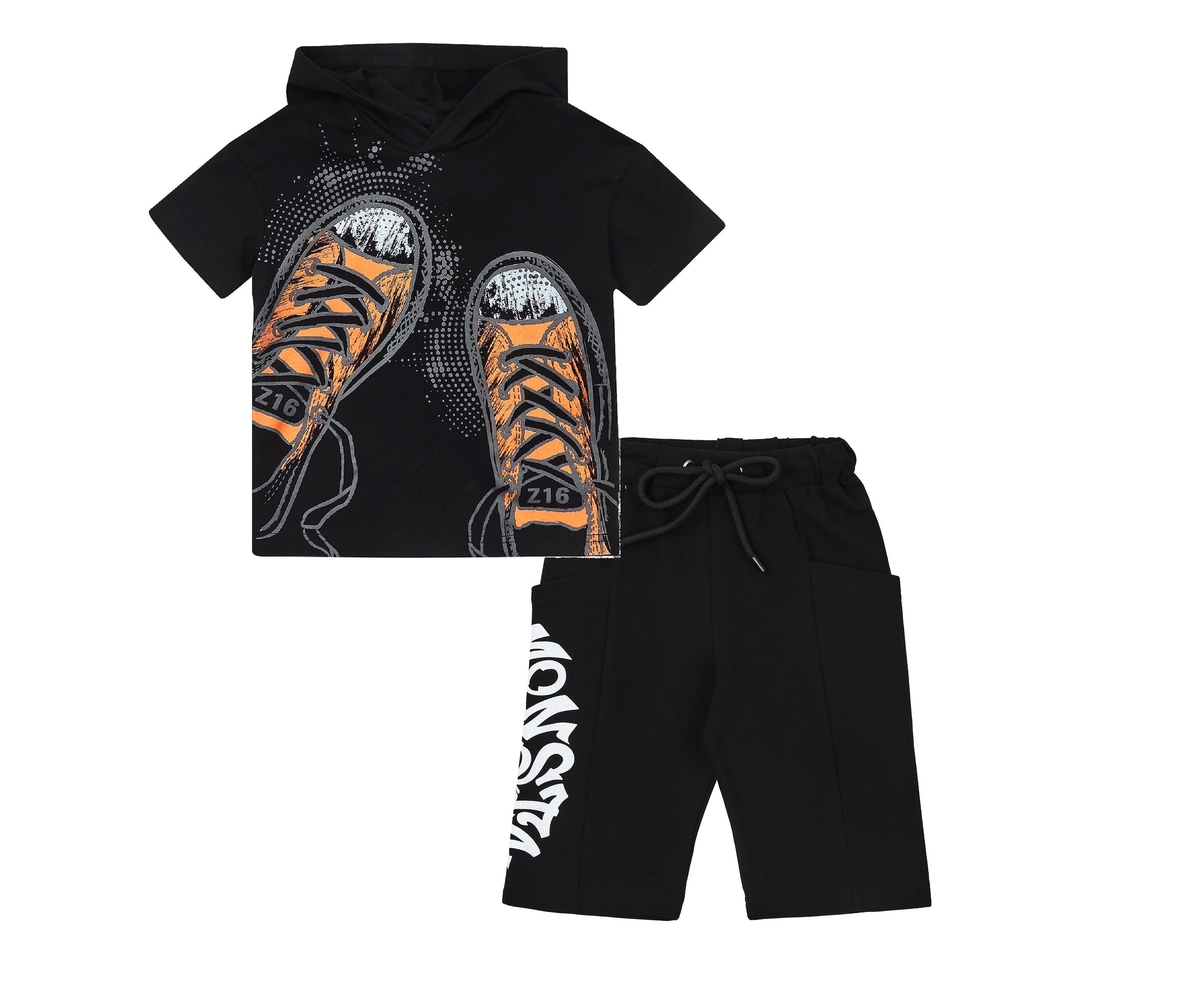 Літній дитячий комплект з футболки та шорт. Футболка з капюшоном з чорного стрейч-куліру (97% бавовна 3% еластан), який добре тримає форму навіть після багаторазового прання. Перед оздоблений стильним принтом. По внутрішньому шву горловини спинки оздоблювальний лампас. Шорти подовжені з якісної чорної лакости, яка добре тримає форму навіть після багаторазового прання. На передніх та задніх половинках вертикальні рельєфи, на бочках вмісткі глибокі кишені, на одному з них друк. Притачний пояс з еластичною тасьмою, а також з функціональним фіксуючим шнуром, продітим через люверси.