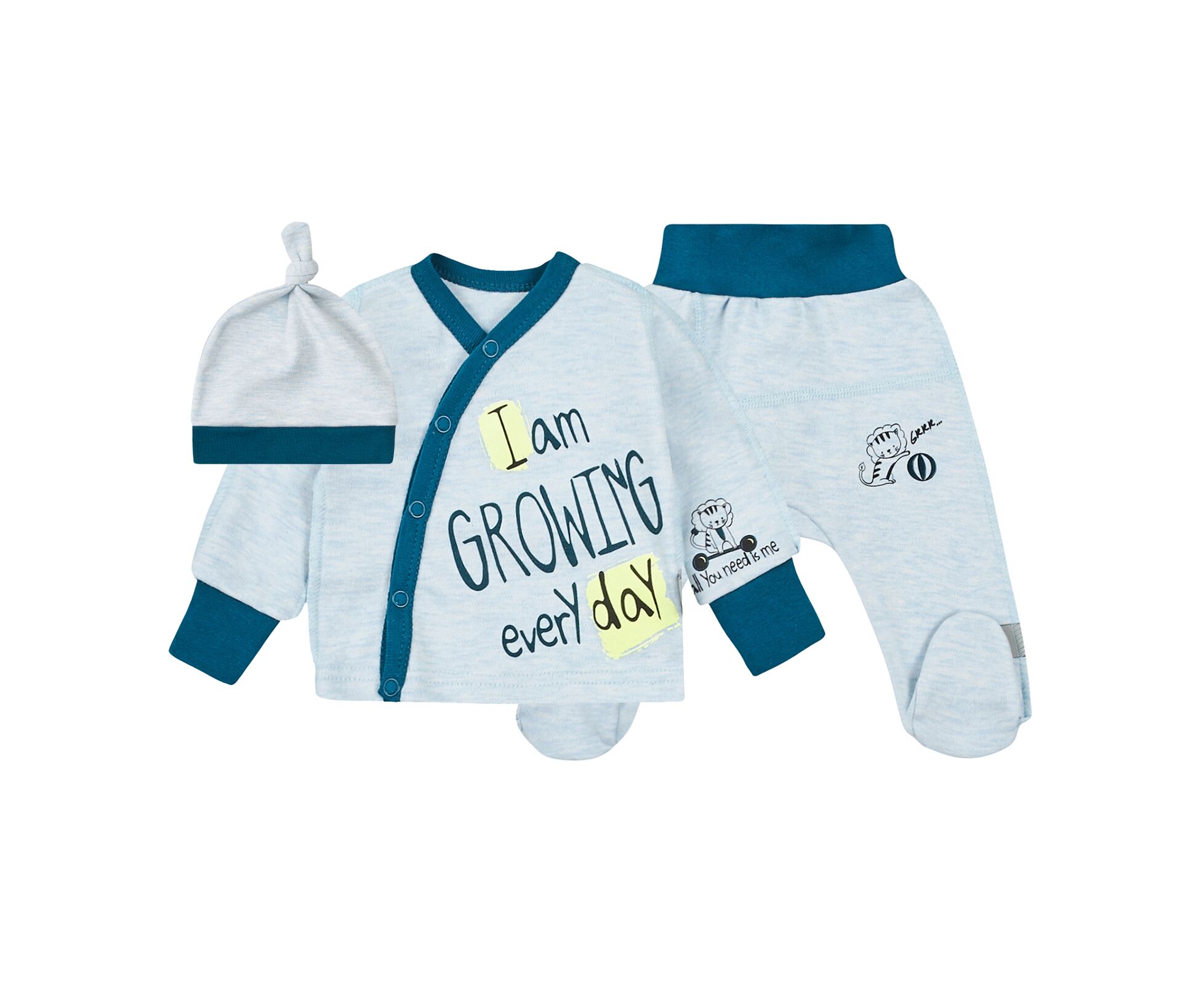 Дитячий комплект з льолі з довгим рукавом, повзунків та шапочки. Виготовлений з наздвичайно якісного бавовняного інтерлока. Льоля з стильним принтом на пілочці та на рукаві. З асиметричною застібкою по переду на кнопки. Зрізи льолі оброблені окантовкою з контрасної бавовняної рібани. Манжети по низу рукава льолі з еластичної рібани та з відворотом, що дозволяє перетворити їх в царапки. Повзунки з ластовицею, без середніх швів, з поясом з еластичної рібани. Шапочка-ковпачок з декоративним вузликом та планкою з еластичної рібани. Натуральний склад полотна та шви назовні в усіх виробах комплекту, які не торкаються шкіри малюка, виключають будь-який дискомфорт та подразнення.