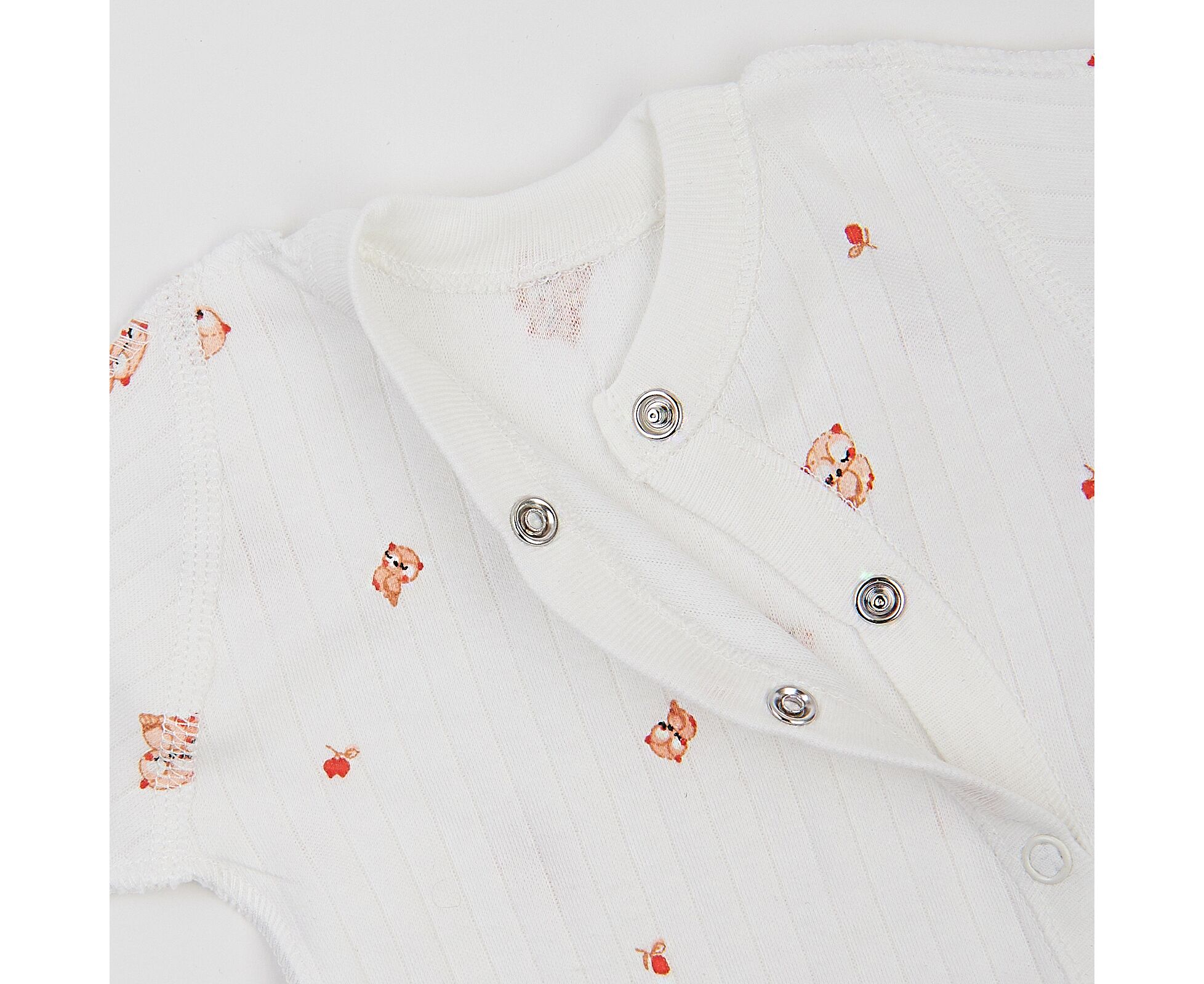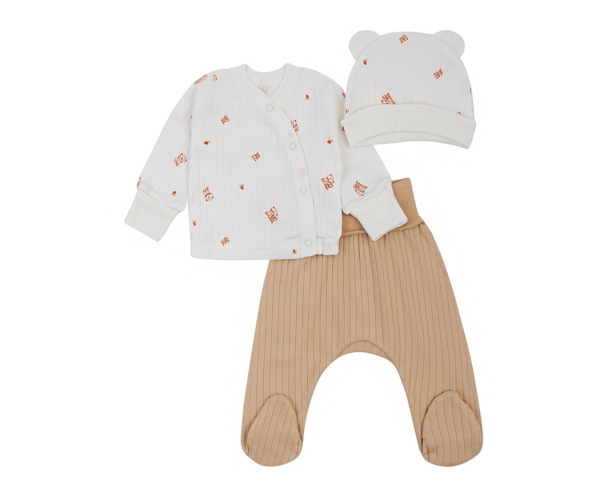 Дитячий комплект для новонароджених. Складається з льолі, повзунків та шапочки. Виготовлений з бавовняного інтерлока преміум якості. Льоля з асиметричною застібкою на кнопки на запах. Зрізи льолі оброблені окантовкою з бавовняної рібани. Рукав реглан, манжети льолі з еластичної рібани та з відворотом, що дозволяє перетворити їх в царапки. Повзунки з ластовицею, без середніх швів, з поясом з еластичної рібани. Шапочка з симпатичними вушками та відворотом по низу з еластичного полотна. Натуральний склад полотна та шви назовні в усіх виробах комплекту, які не торкаються шкіри малюка, виключають будь-який дискомфорт та подразнення.