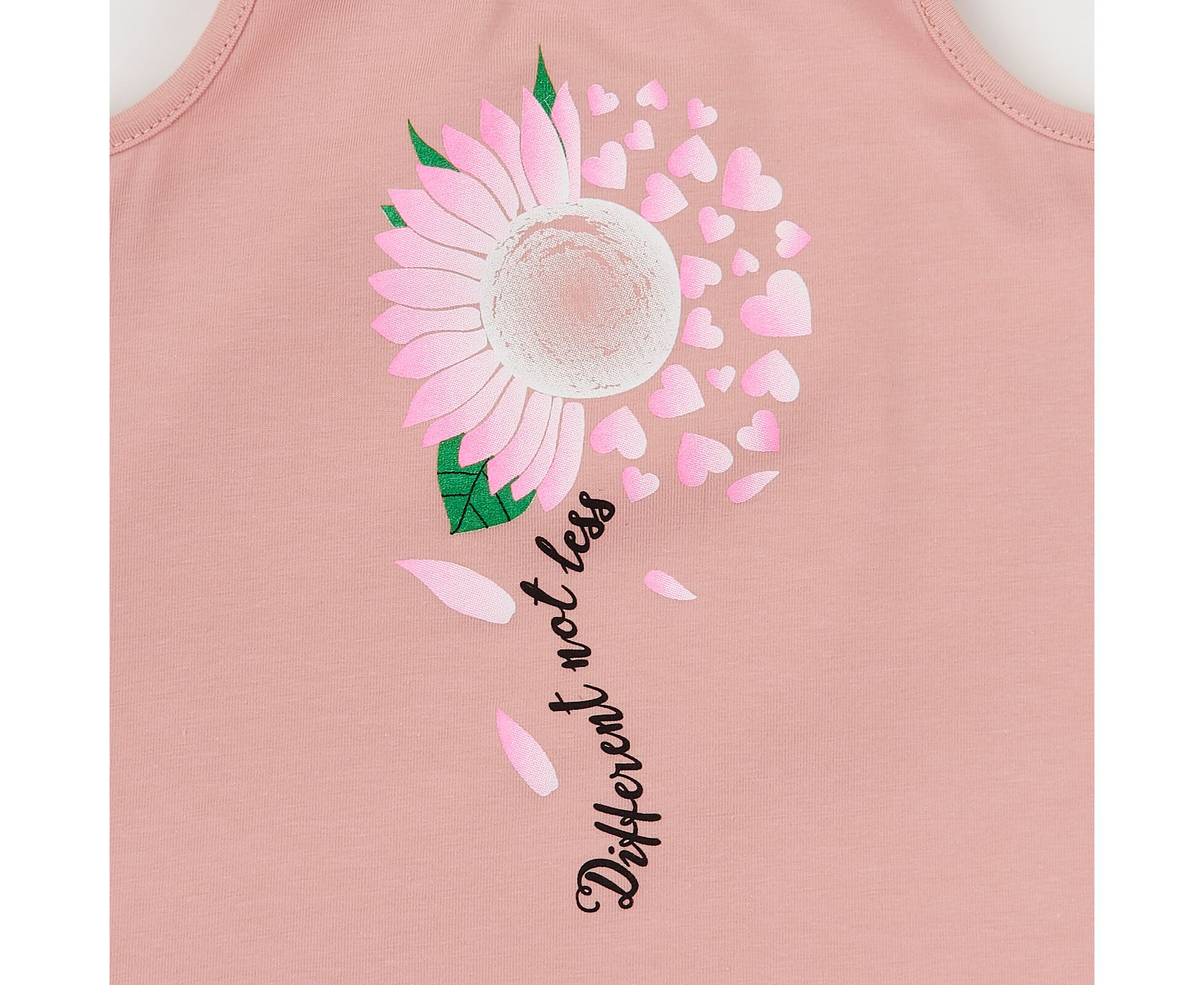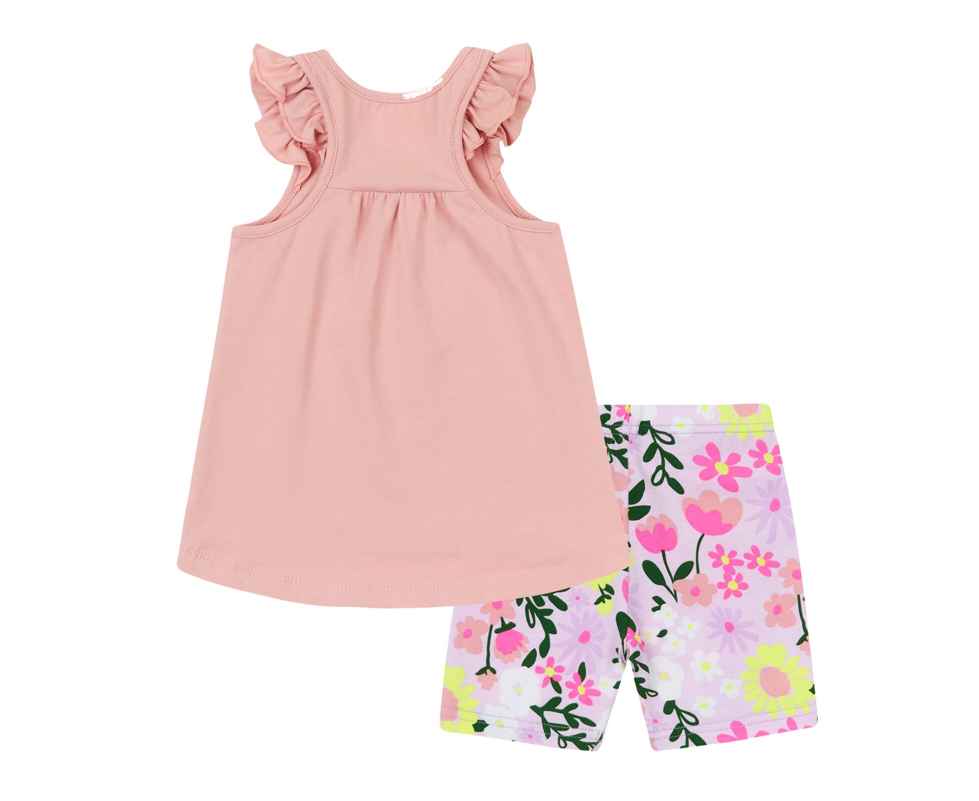 Літній комплект для дівчинки з майки-туніки та велосипедок , з якісного стрейч-куліру, який добре тримає форму та колір навіть після багаторазового прання. Майка з яскравим принтом на переді, рюшами-крильцями на плечах, горловина та пройми окантовані руликом. Спинка майки з кокеткою та призборкою, з фігурною лінією низа - трошки подовженою. Велосипедки з цільнокроєним поясом на резинці.