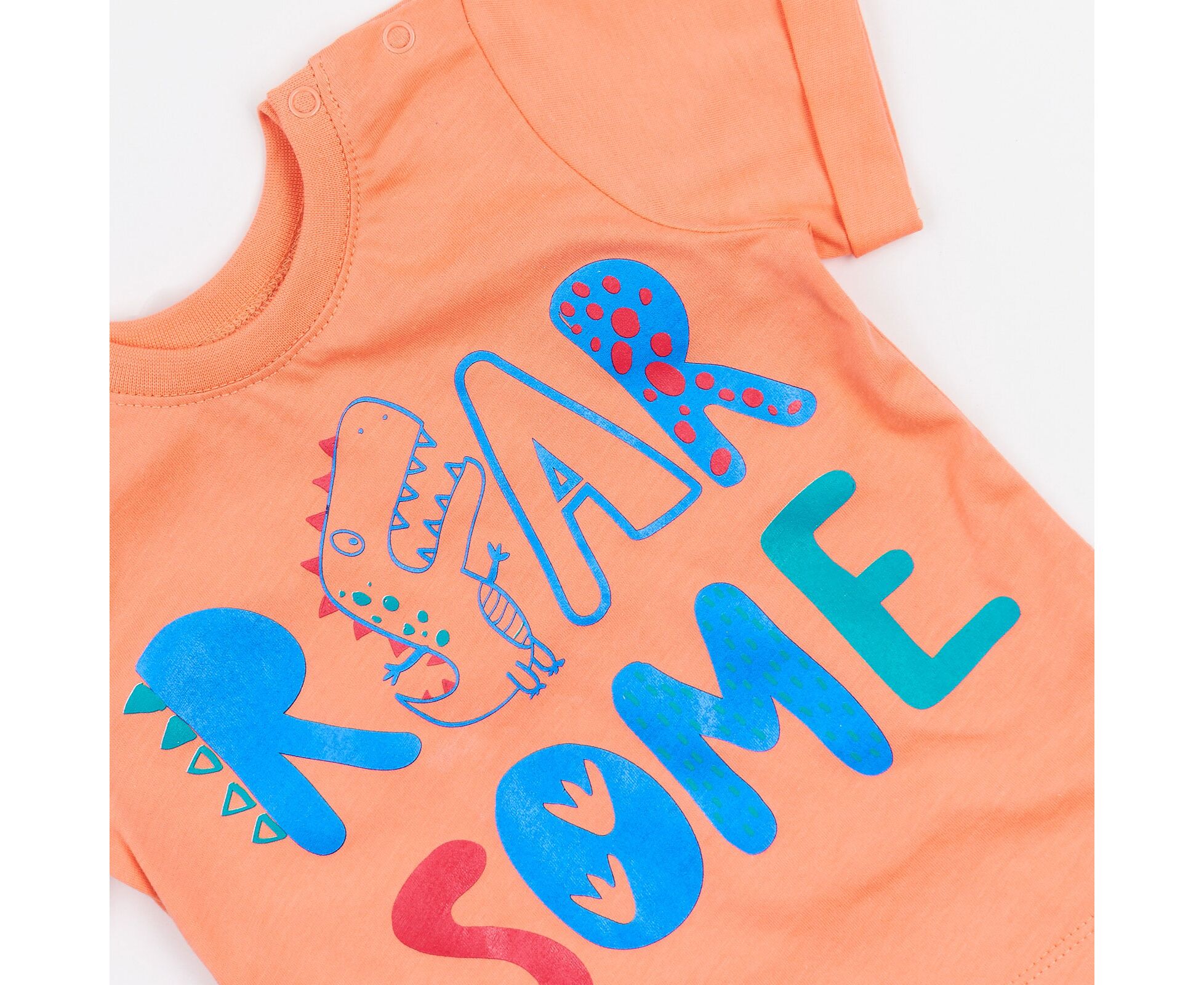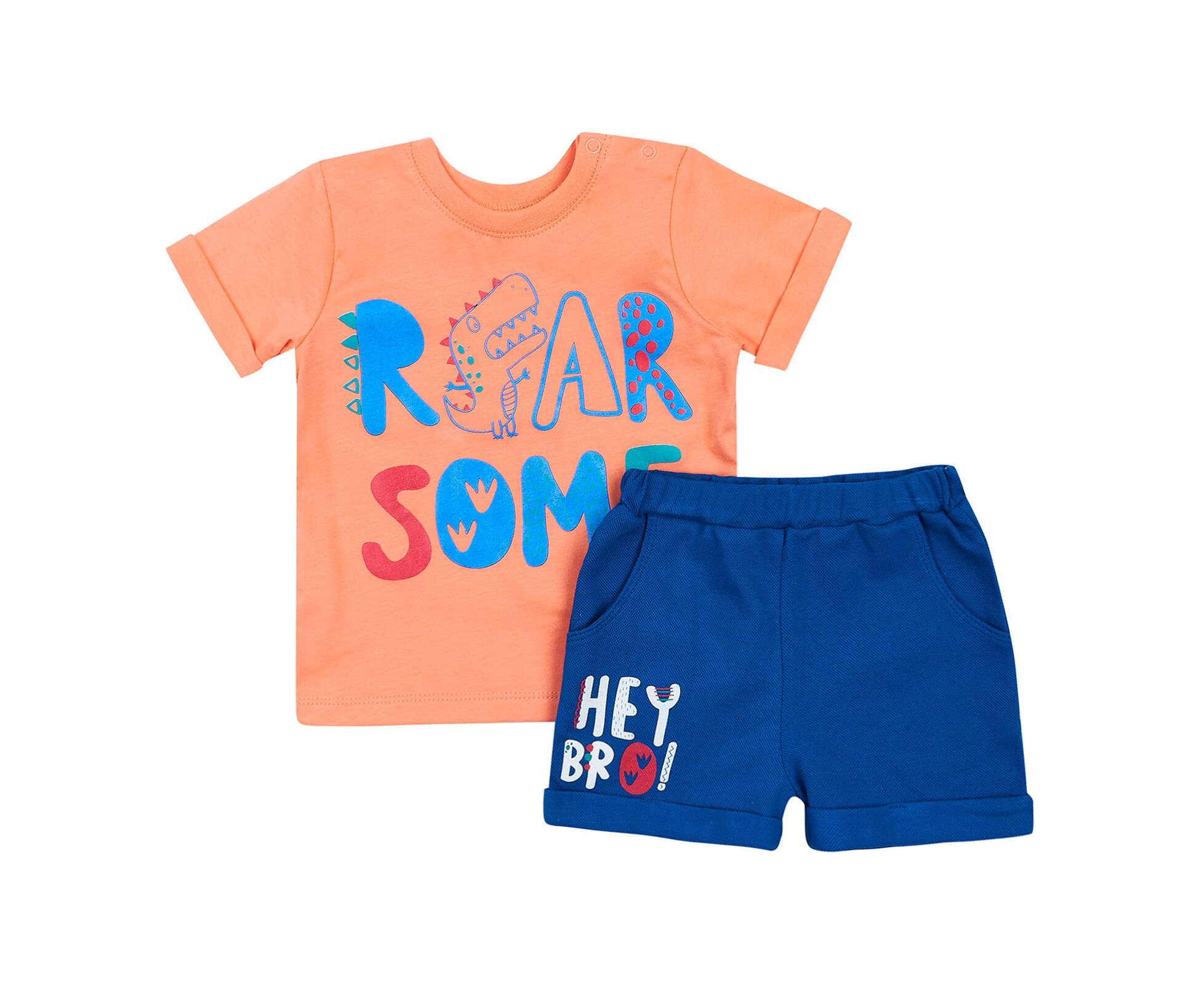 Дитячий літній комплект для хлопчиків. Комплект з футболки та шорт. Футболка з якісного бавовняного куліру. На переді яскравий друк. Рукав втачний, з застібкою на плечі на кнопки. По горловині футболки еластична планка. Шорти з бавовняної лакости, яка дуже зручна в експлуатації. Шорти з боковими кишенями, прикрашені стильним друком. Пояс притачний, з продітою гумкою. По низкам шорт та по низу рукавів футболки подвійні відвороти, закріплені в декількох місцях.