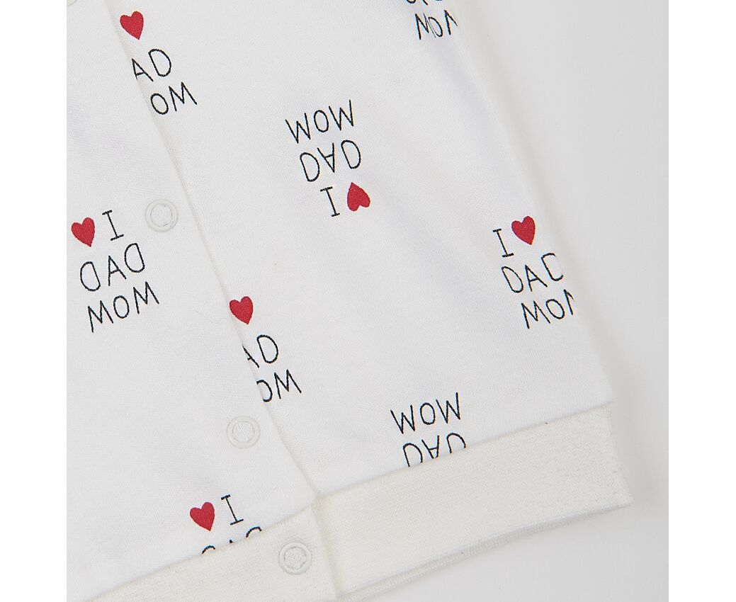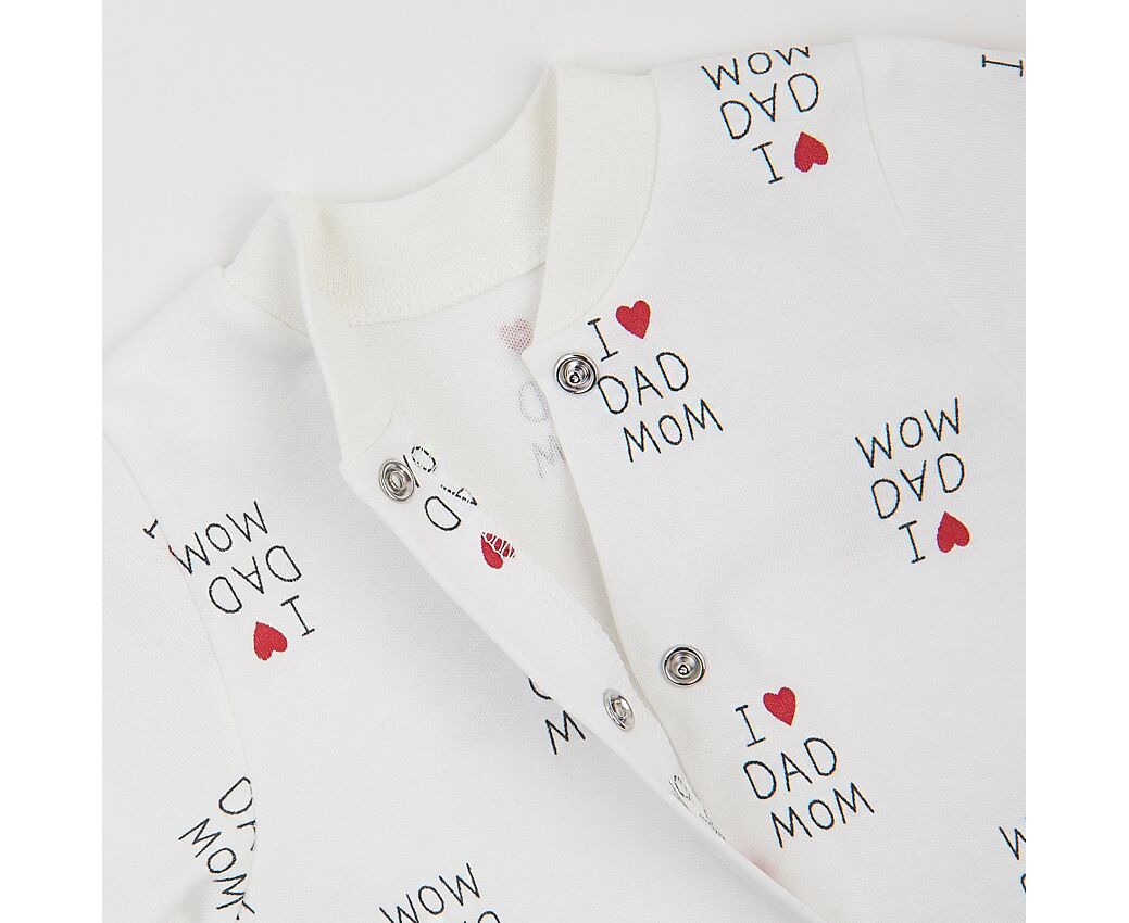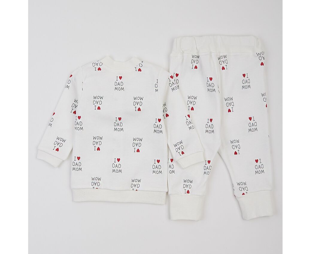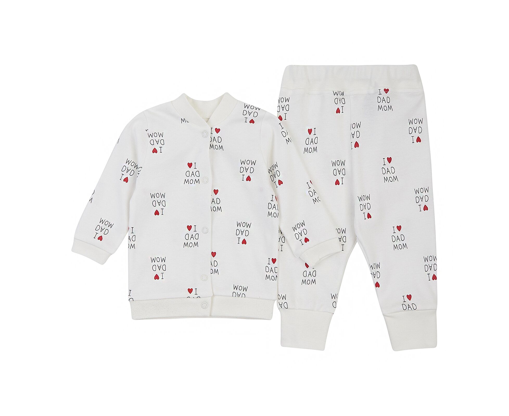 Дитячий комплект з кофточки та штанців, виготовлений з натурального, м'якого інтерлоку преміум якості. Кофточка з принтованої тканини, з центральною застібкою на кнопки. Рукав втачний. Стійка, манжети по низу рукавів та пояс по низу кофти з еластичного полотна. Штани однотонні, з притачним поясом з продітою еластичною тасьмою. Пояс та манжети штанів з еластичного полотна.