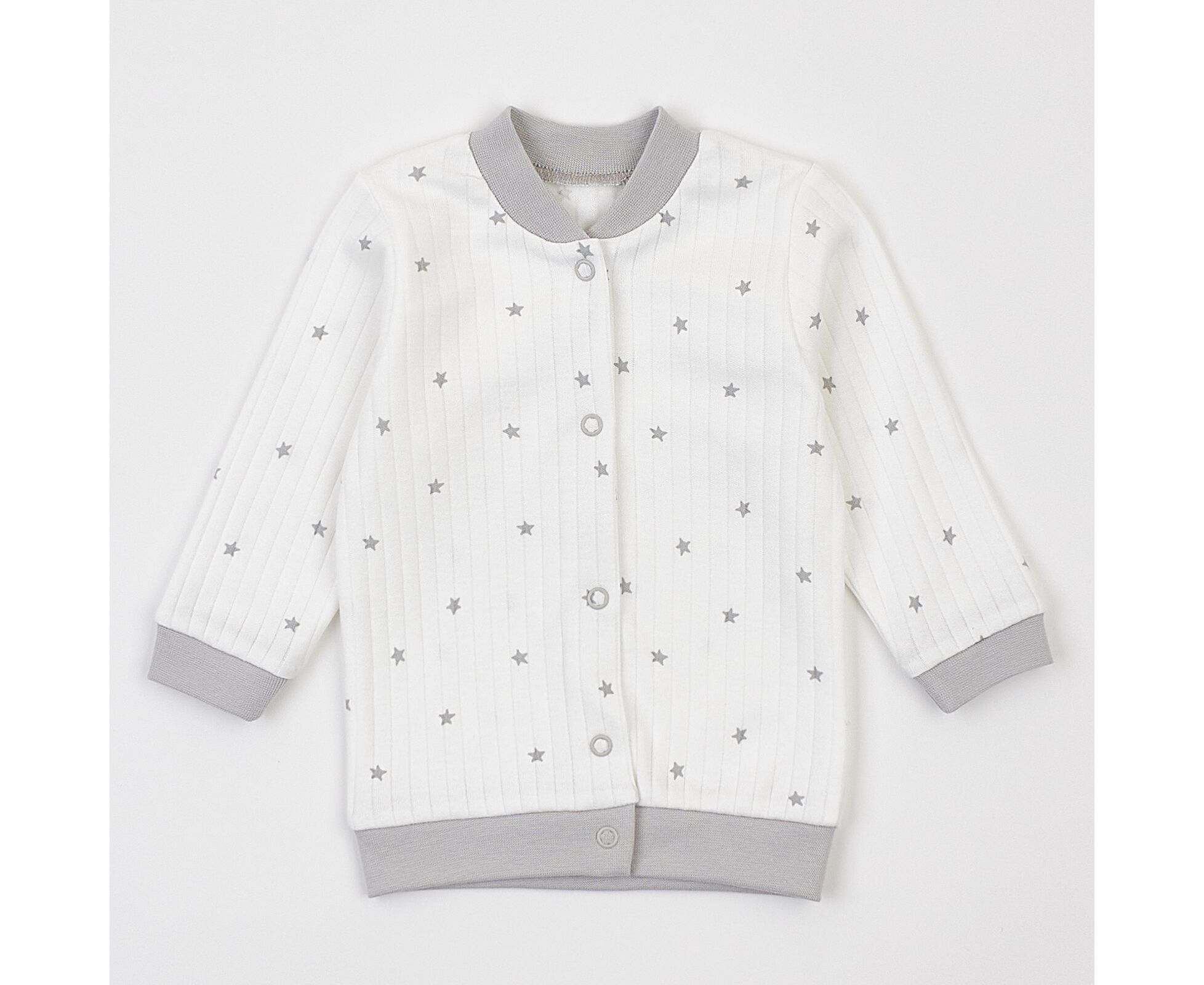 Дитячий комплект з кофточки та штанців, виготовлений з натурального, м'якого інтерлоку преміум якості. Кофточка з принтованої тканини, з центральною застібкою на кнопки. Рукав втачний. Стійка, манжети по низу рукавів та пояс по низу кофти з еластичного полотна. Штани однотонні, з притачним поясом з продітою еластичною тасьмою. Пояс та манжети штанів з еластичного полотна.