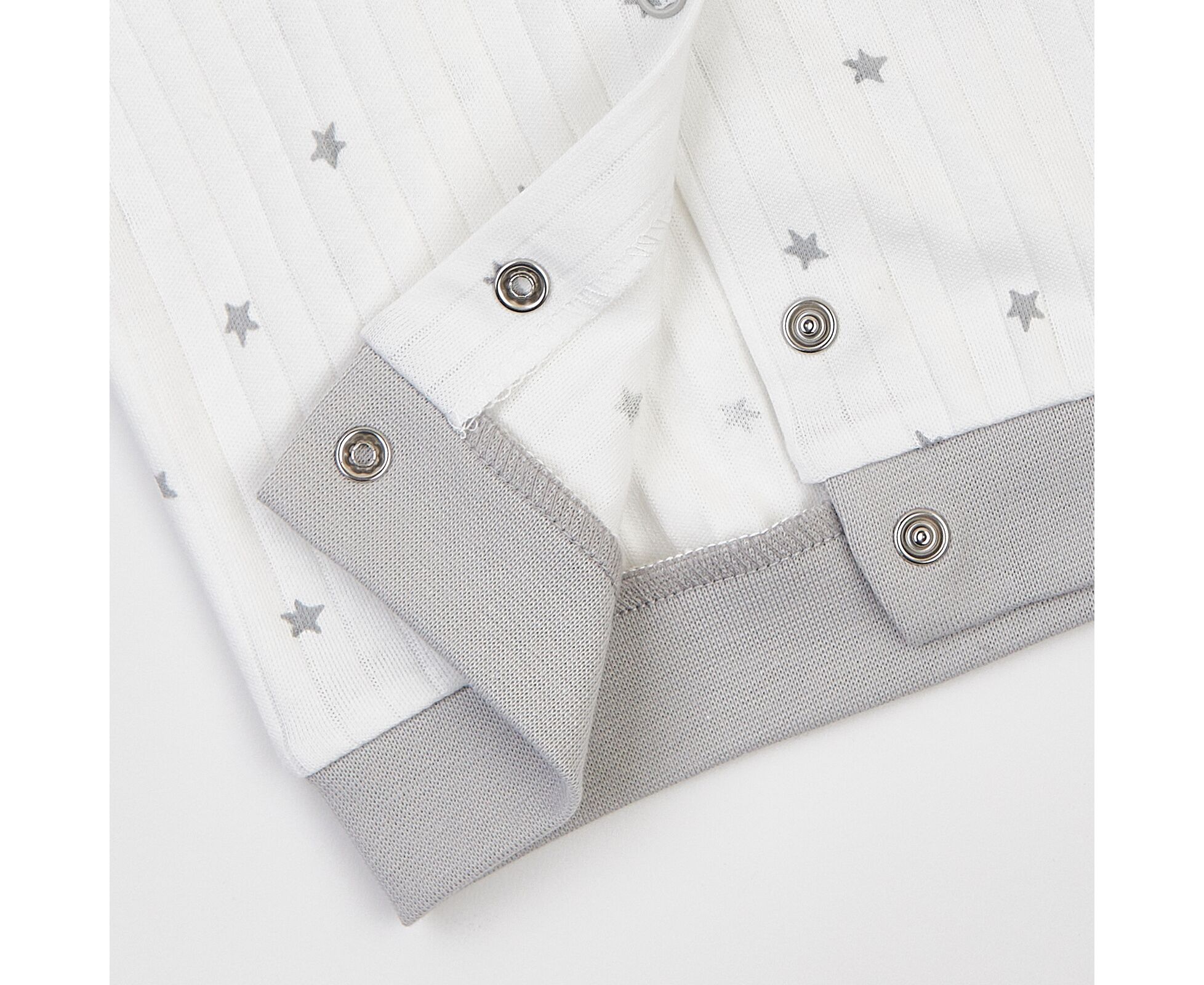 Дитячий комплект з кофточки та штанців, виготовлений з натурального, м'якого інтерлоку преміум якості. Кофточка з принтованої тканини, з центральною застібкою на кнопки. Рукав втачний. Стійка, манжети по низу рукавів та пояс по низу кофти з еластичного полотна. Штани однотонні, з притачним поясом з продітою еластичною тасьмою. Пояс та манжети штанів з еластичного полотна.