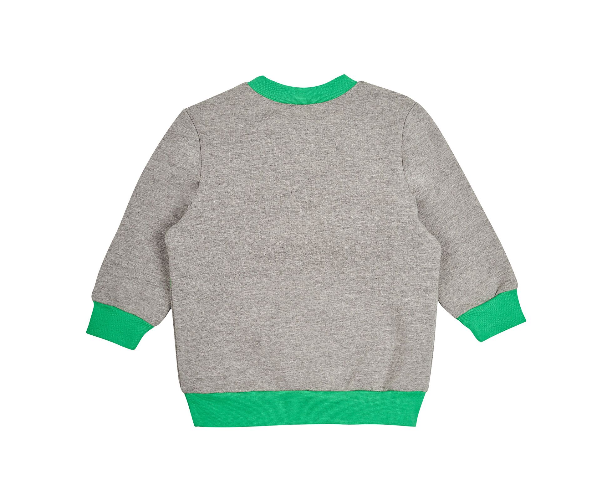 Дитячий костюм з стильного меланжевого світшоту та чорних штанів. Виготовлений з двонитки преміум якості. На переді світшоту фактурний принт. Застібка на плечі на дві кнопки. Стійка горловини, пояс по низу світшоту та манжети рукавів з контрасного еластичного полотна.. Штани з чорної двонитки з манжетами по низкам з фактурного еластичного полотна. Пояс застрочений з еластичною гумкою.
