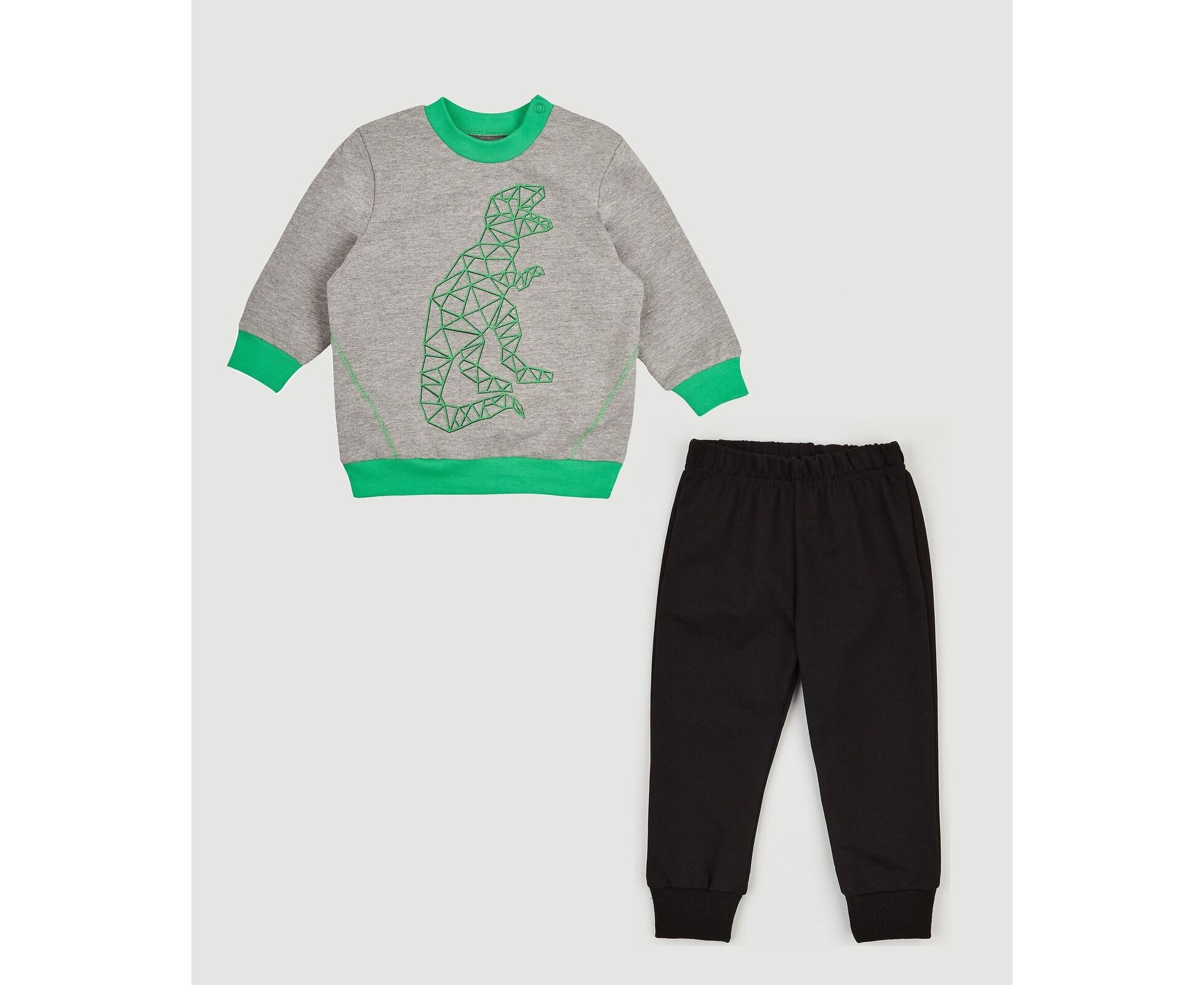 Дитячий костюм з стильного меланжевого світшоту та чорних штанів. Виготовлений з двонитки преміум якості. На переді світшоту фактурний принт. Застібка на плечі на дві кнопки. Стійка горловини, пояс по низу світшоту та манжети рукавів з контрасного еластичного полотна.. Штани з чорної двонитки з манжетами по низкам з фактурного еластичного полотна. Пояс застрочений з еластичною гумкою.