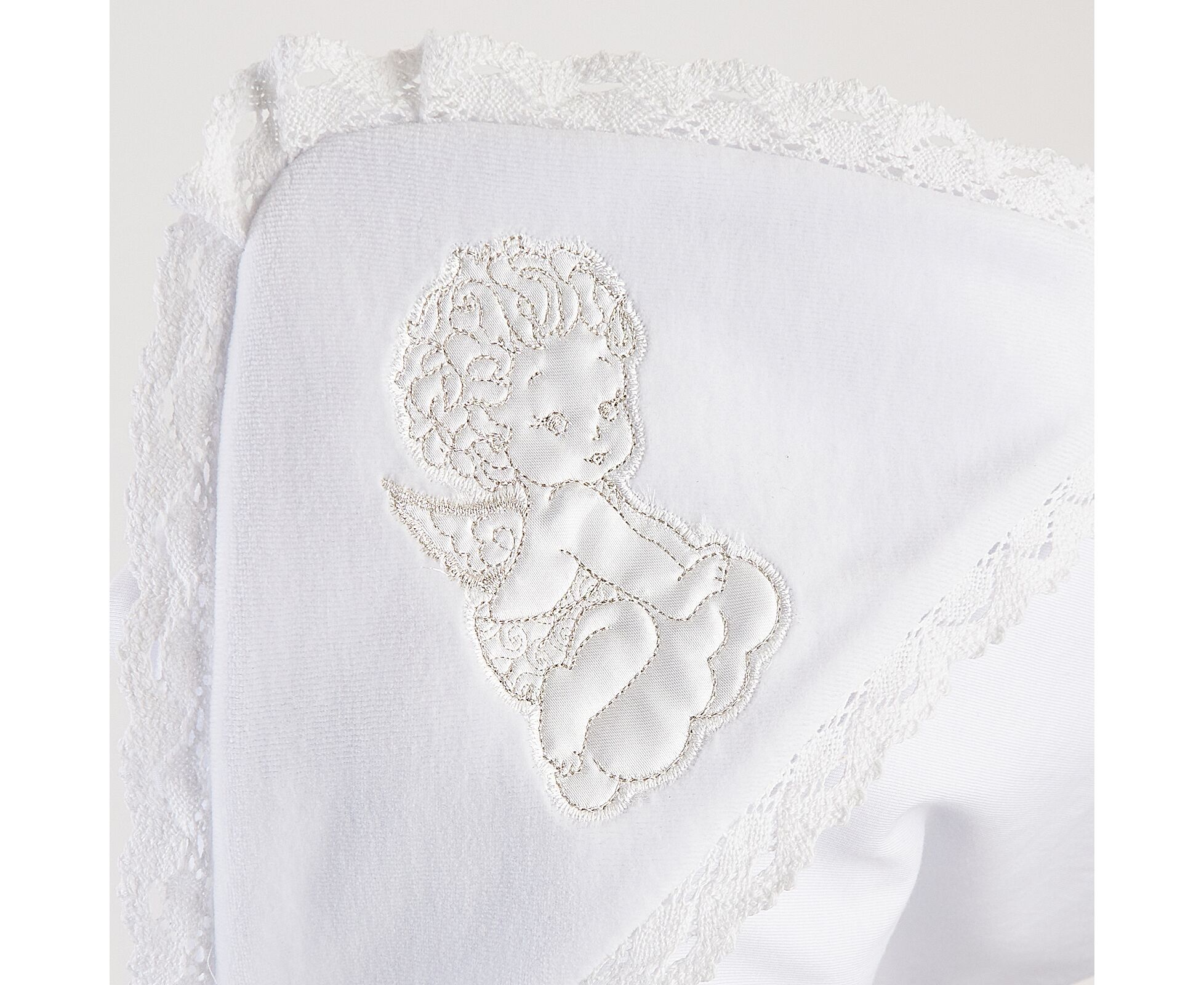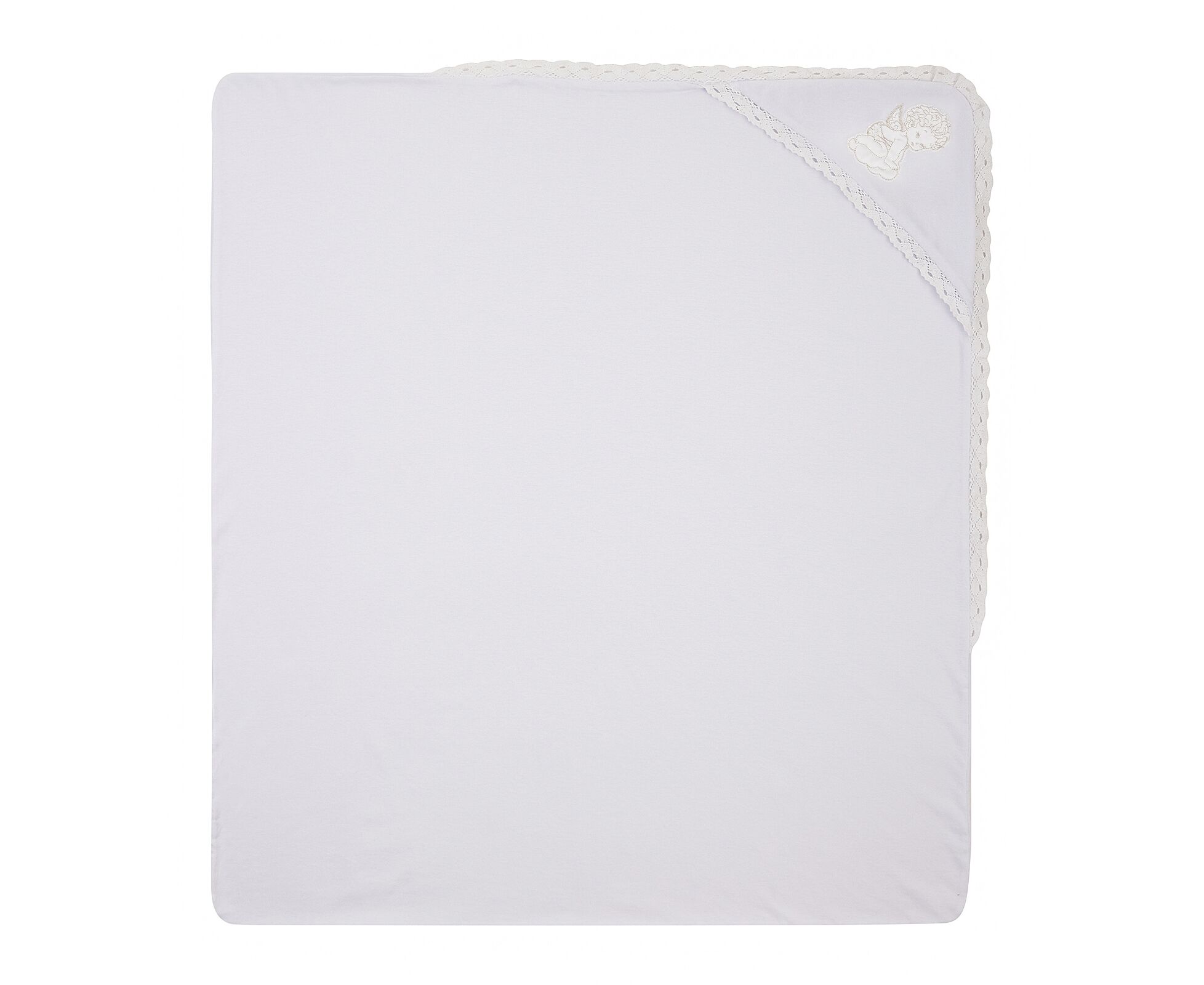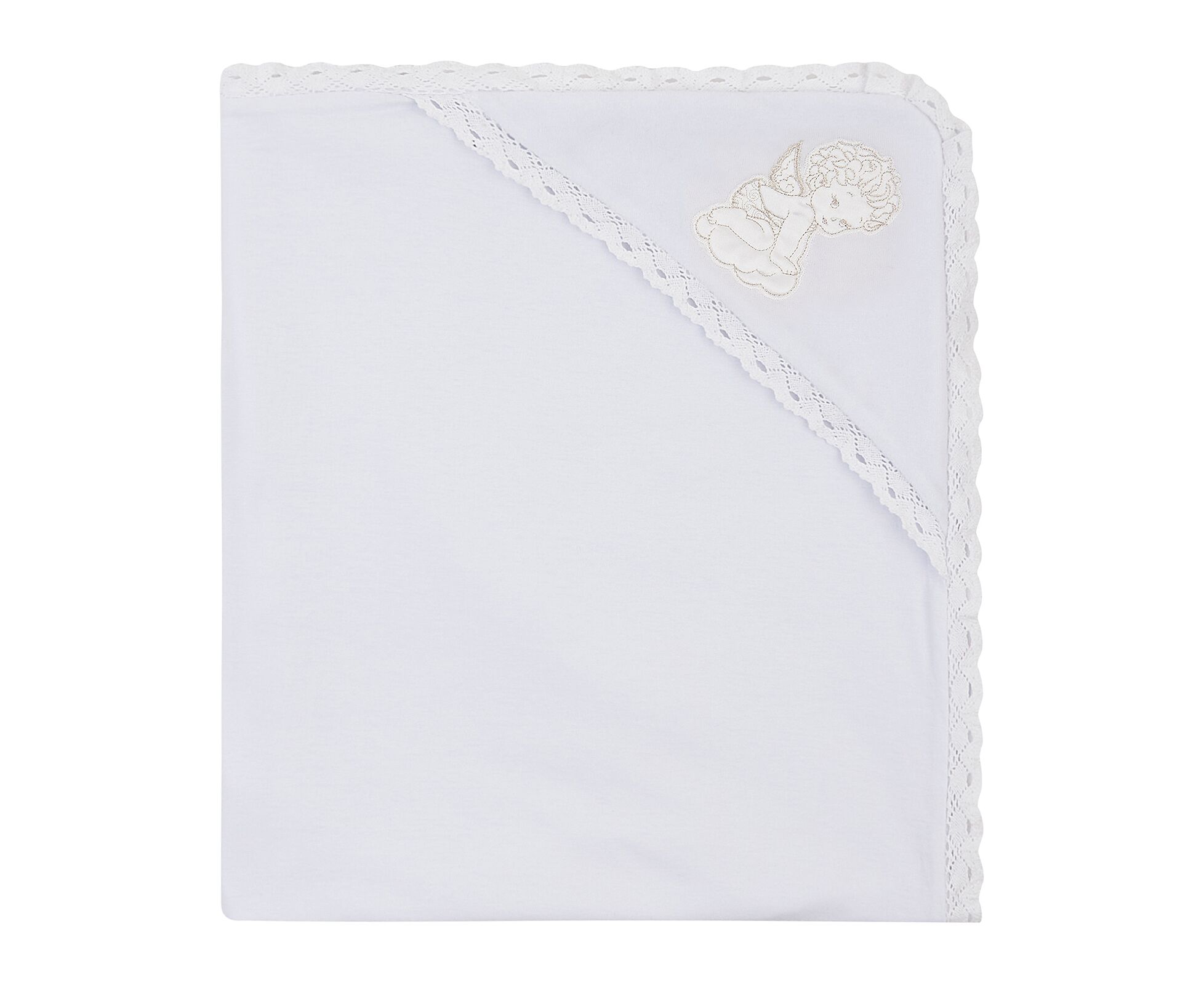 Крижма для хрещення новонароджених. Виготовлена з м'якенького, дуже приємного на дотик велюру преміум якості, повністю на трикотажній бавовняній підкладці, з куточком, прикрашеним блискучою вишивкою та широким лляним мереживом по всьому периметру виробу.