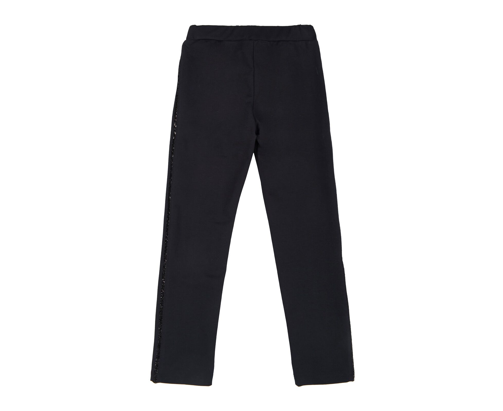 Штани-лосини для дівчинки, дуже зручні, з хорошою посадкою на фігурі. Виготовлені з якісної еластичної двонитки, яка не втрачає зовнішній вигляд навіть при тривалій експлуатації. На передніх половинках декортивні строчки, імітуючі гульфик та бокові кишені. В бокових швах тоненькі лампасики з люрексової тасьми, зсередини оброблені тканиною, що запобігає торкання шкіри дитини.