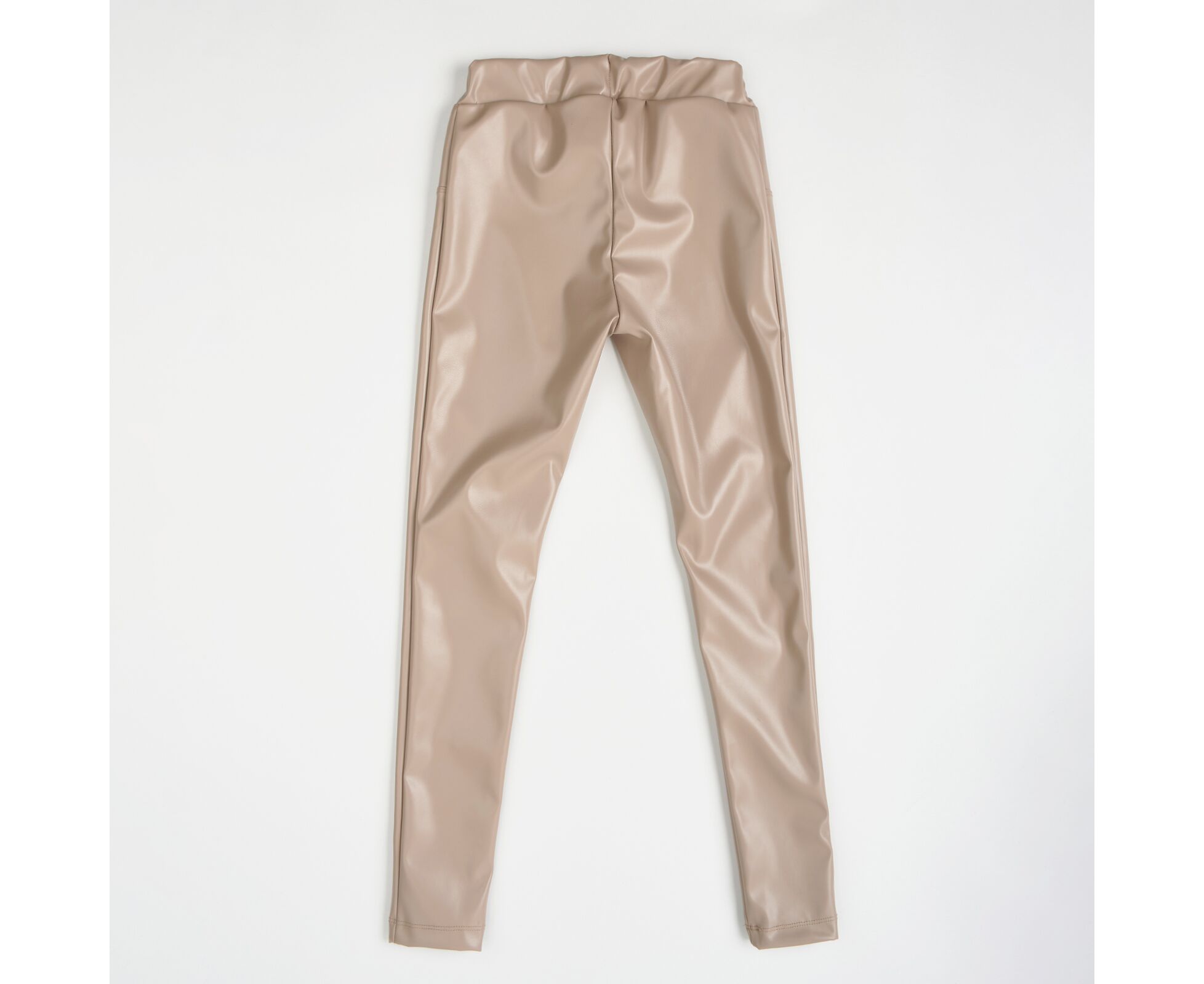 Еластичні лосини з м'якої екокожи. По поясу еластична тасьма. На передніх половинках декоративні строчки, що імітують гульфік та лінії бокових кишень.