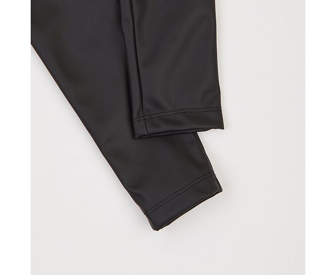 Еластичні лосини з м'якої екокожи. По поясу еластична тасьма. На передніх половинках декоративні строчки, що імітують гульфік та лінії бокових кишень.