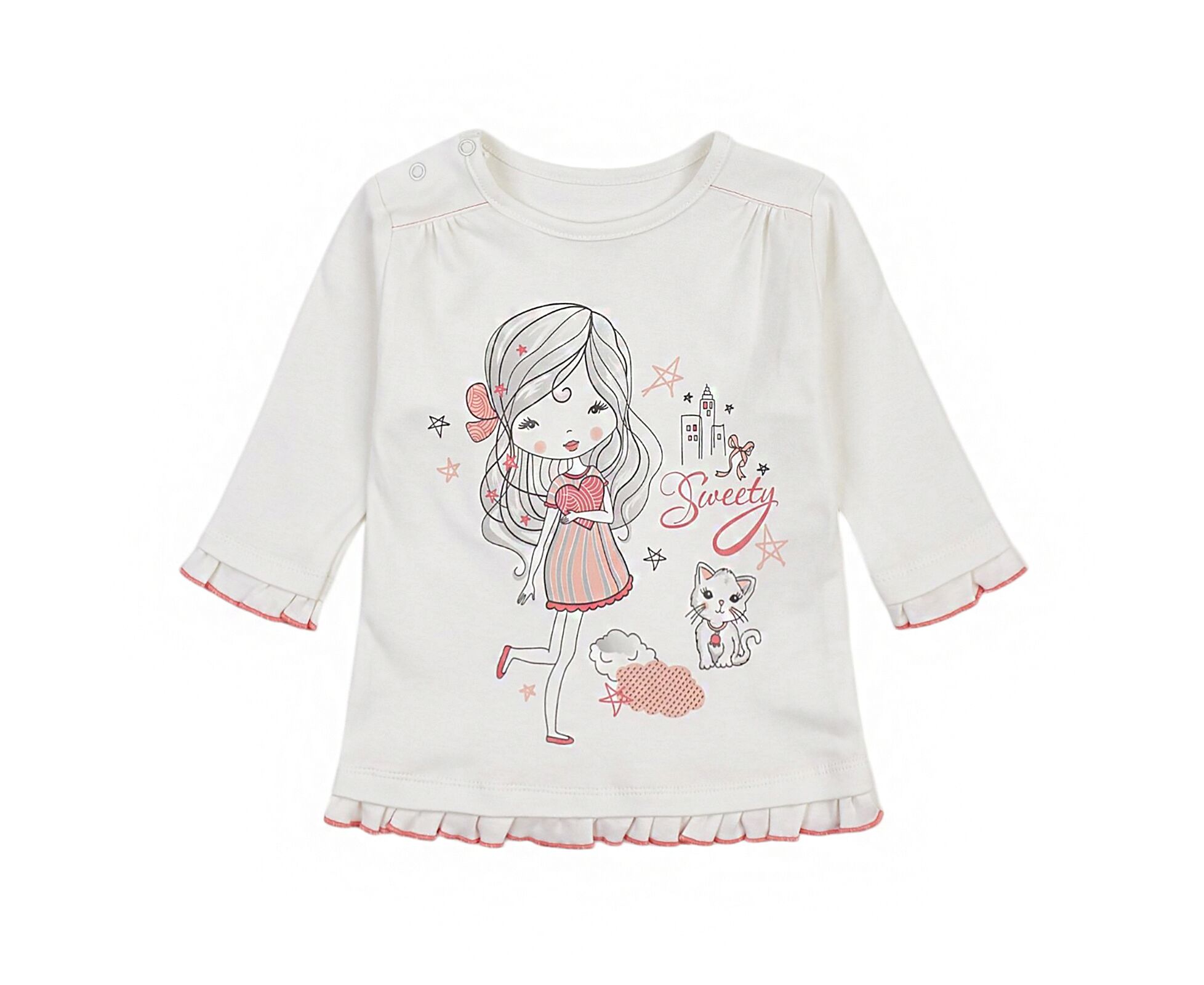 Мила кофтинка для маленьких красунь. Білий лонгслів з стильним друком на переді, виготовлений з інтерлока - 100% бавовняної трикотажної тканини преміум якості. Застібка по плечу на кнопки. Збірка по кокеткам переда та рюшики по низу виробу та низу рукавів надають образу романтичного стилю.