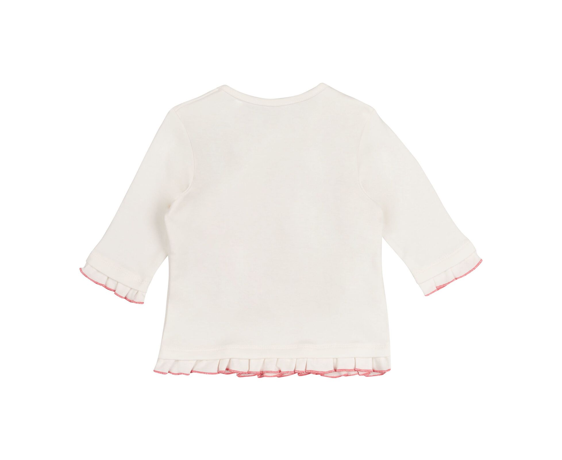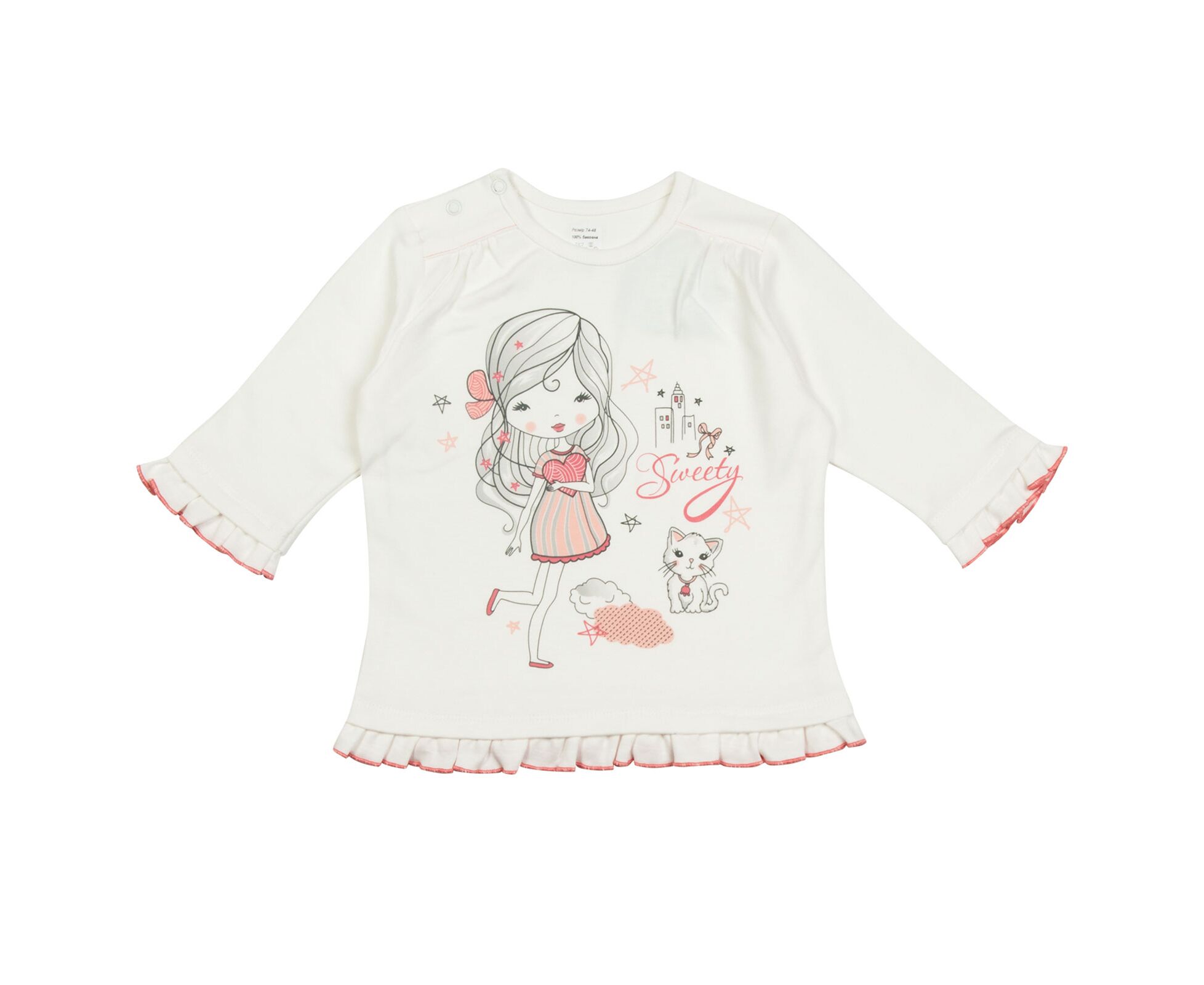 Мила кофтинка для маленьких красунь. Світло-молочний лонгслів з стильним друком на переді, виготовлений з інтерлока - 100% бавовняної трикотажної тканини преміум якості. Застібка по плечу на кнопки. Збірка по кокеткам переда та рюшики по низу виробу та низу рукавів надають образу романтичного стилю.