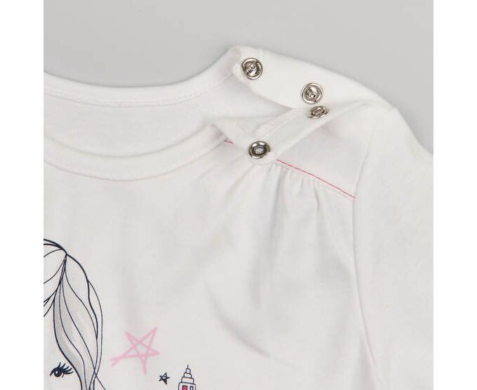Мила кофтинка для маленьких красунь. Білий лонгслів з стильним друком на переді, виготовлений з інтерлока - 100% бавовняної трикотажної тканини преміум якості. Застібка по плечу на кнопки. Збірка по кокеткам переда та рюшики по низу виробу та низу рукавів надають образу романтичного стилю.