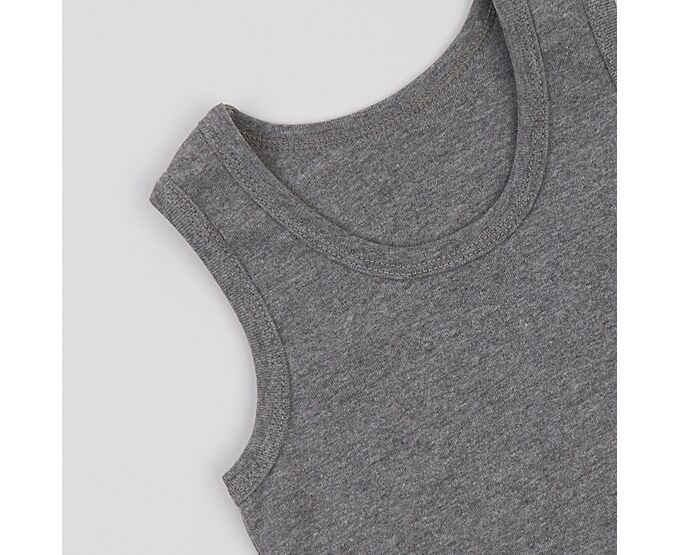 Майка дитяча, з меланжевої бавовняної рібани без еластану. Пройми та горловина оброблені окантовкою.