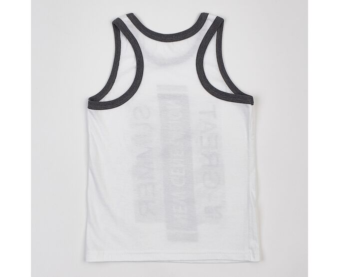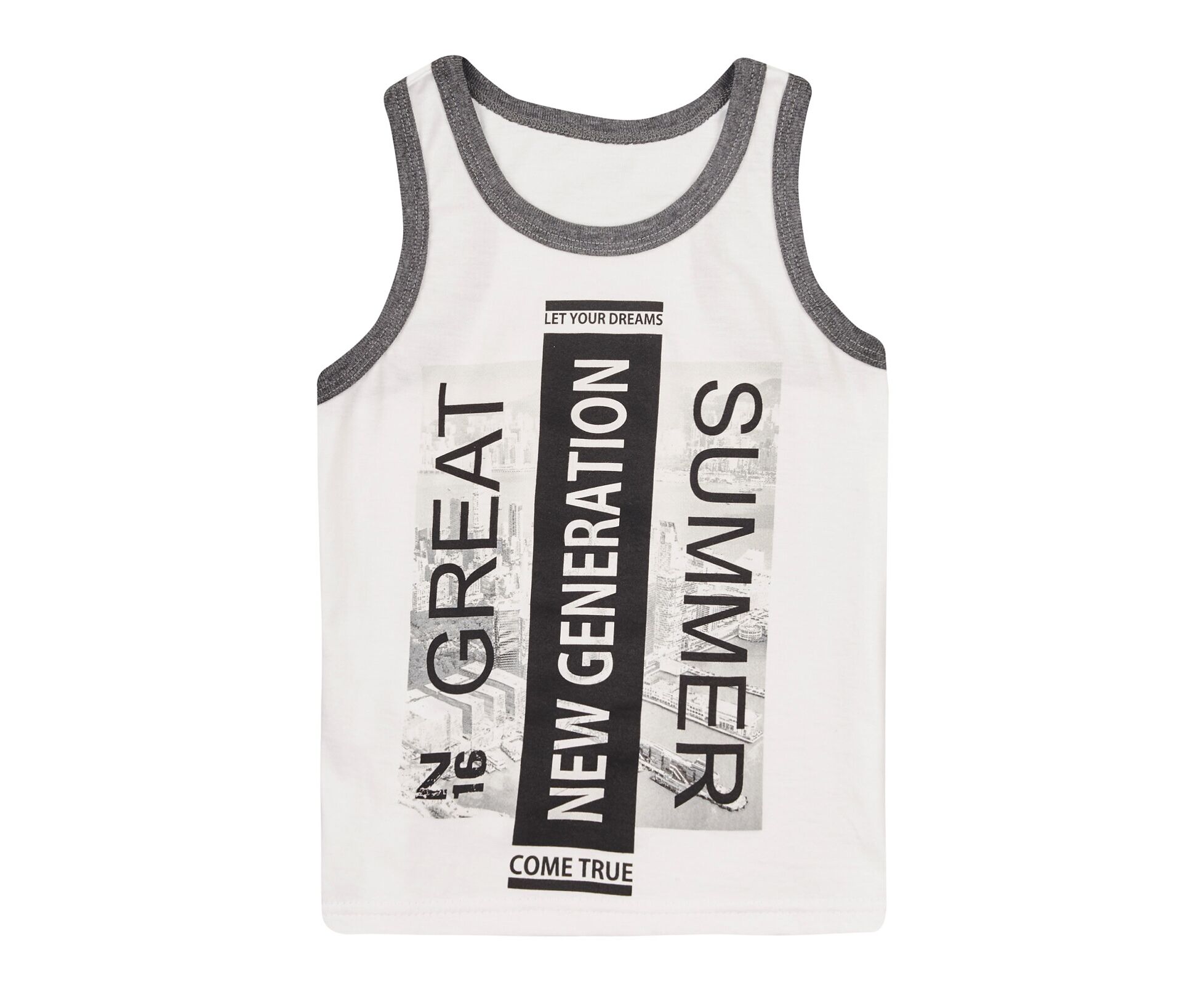 Майка для хлопчика з білого куліру (100%бавовна), з друком на переді. Горловина та пройми оброблені рібаною без еластану .