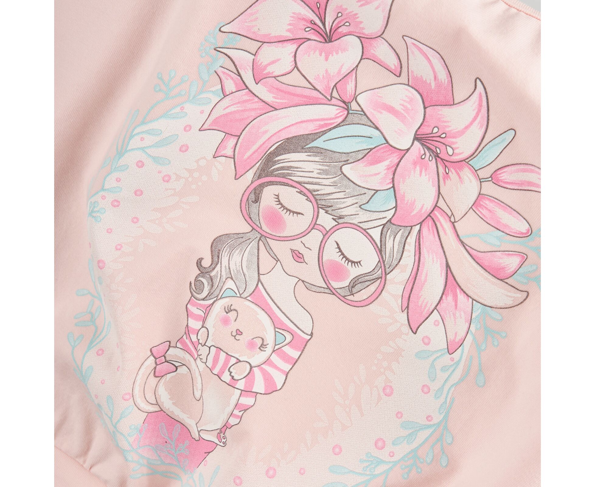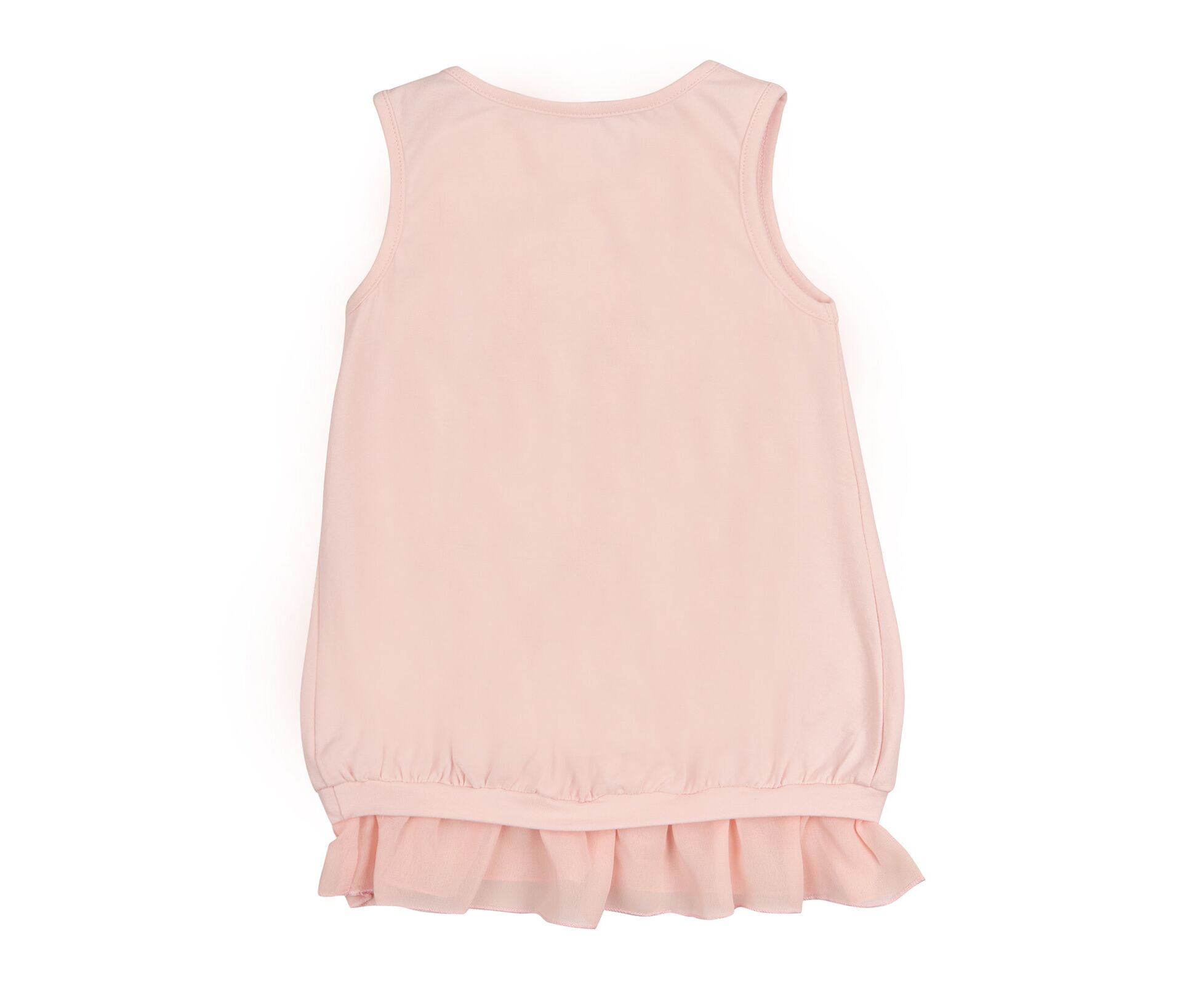 Майка-туніка для дівчинки, з персикового стрейч-куліру з стильним принтом на переді, горловина та пройми окантовані руликом. По низу майки під планкою пришивний рюш з шифону