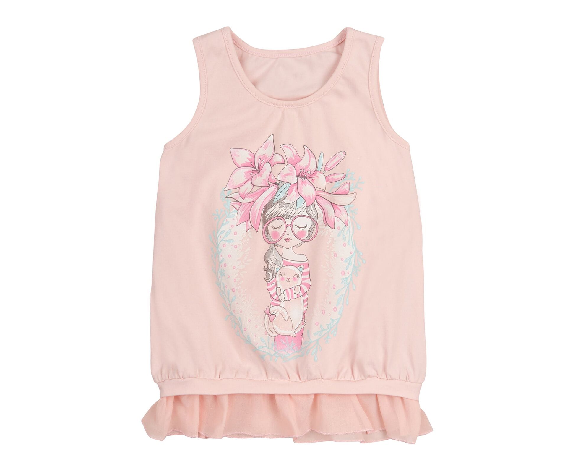 Майка-туніка для дівчинки, з персикового стрейч-куліру з стильним принтом на переді, горловина та пройми окантовані руликом. По низу майки під планкою пришивний рюш з шифону