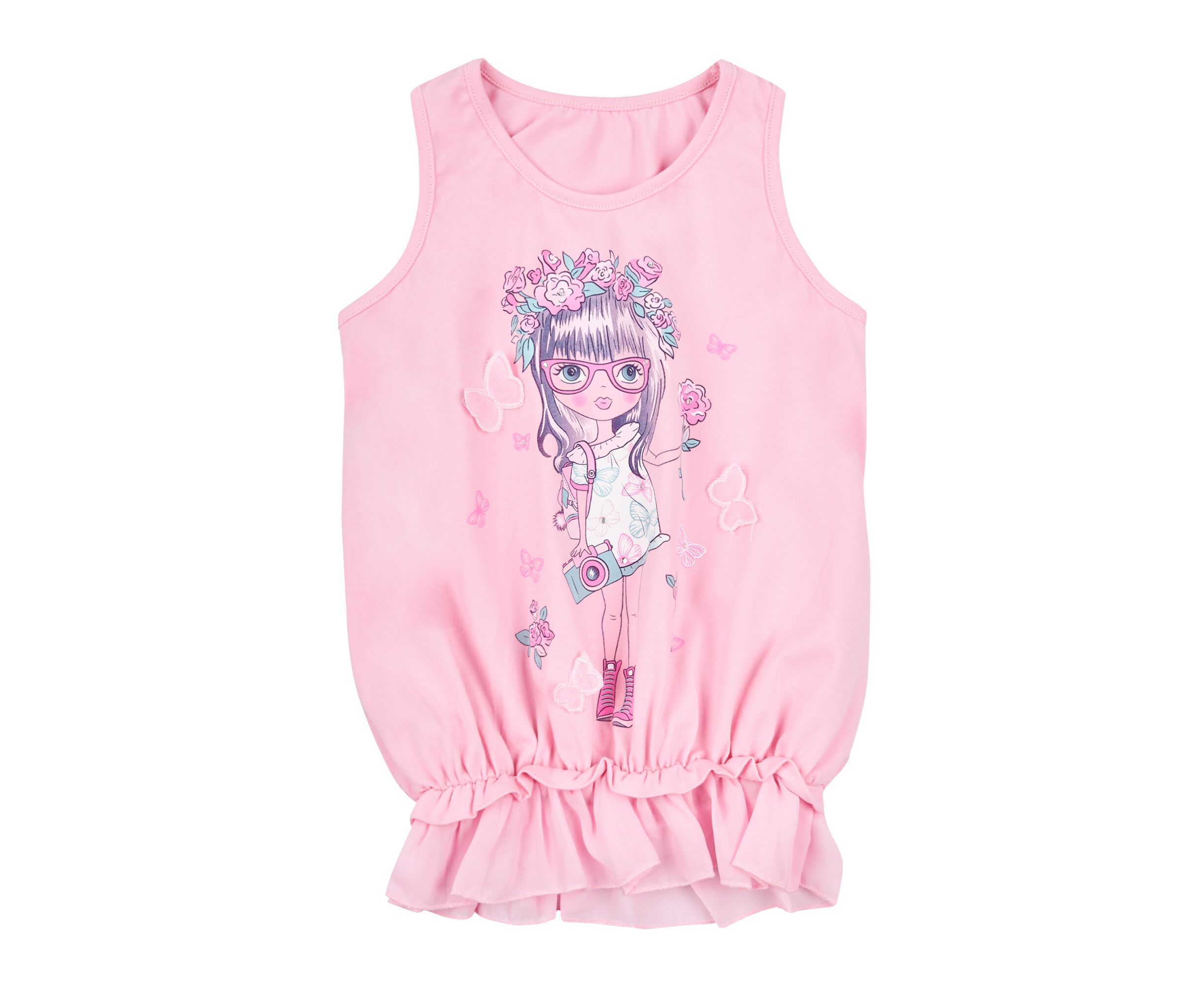 Майка-туніка для дівчинки, з рожевого стрейч-куліру з стильним принтом на переді, горловина та пройми окантовані руликом. По низу майки під планкою пришивний рюш з шифону