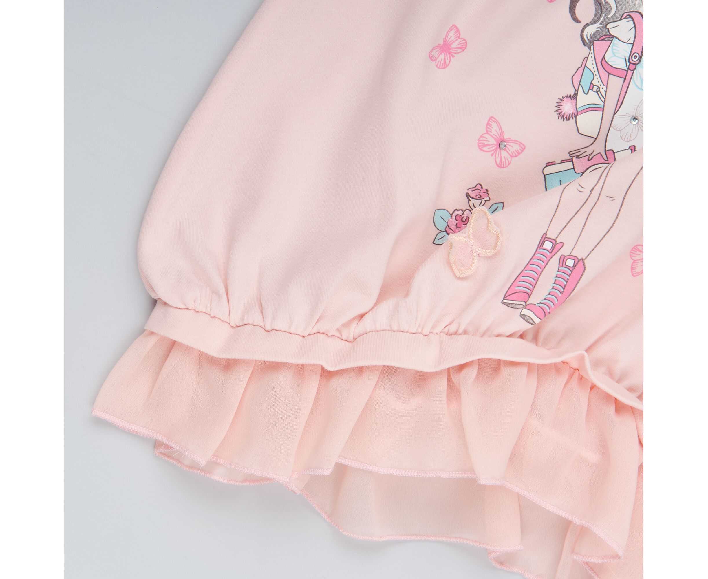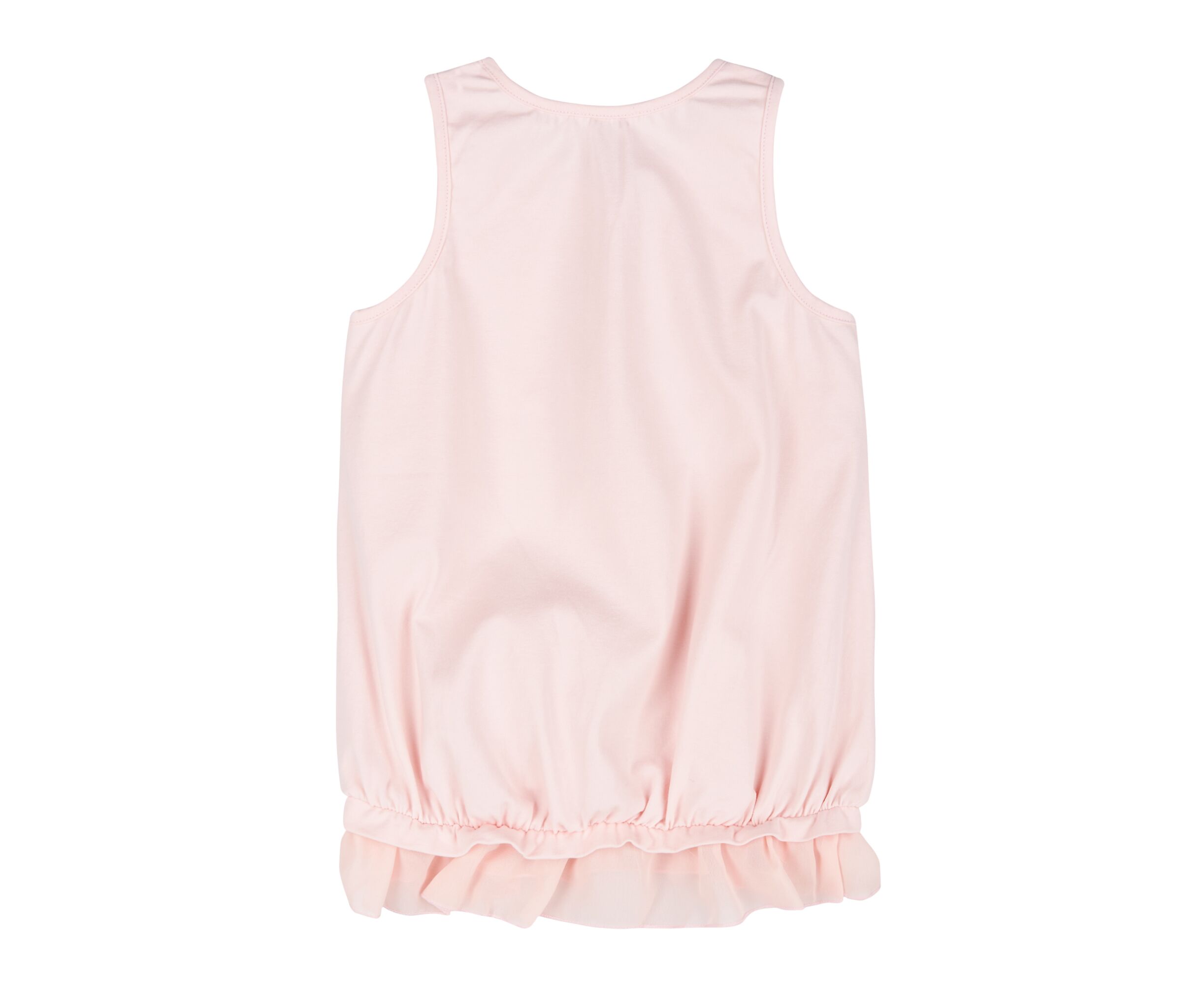 Майка-туніка для дівчинки, з персикового стрейч-куліру з стильним принтом на переді, горловина та пройми окантовані руликом. По низу майки під планкою пришивний рюш з шифону