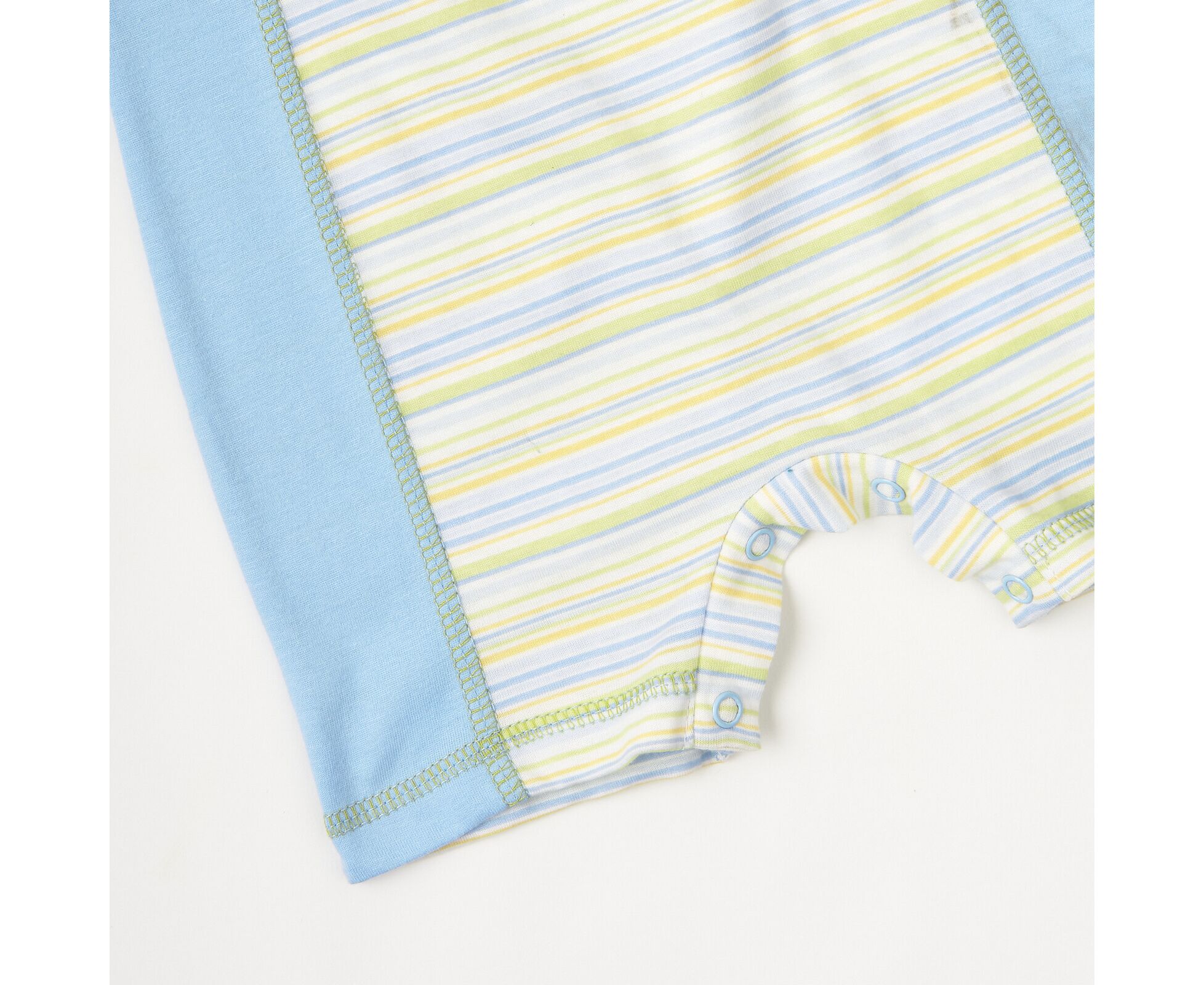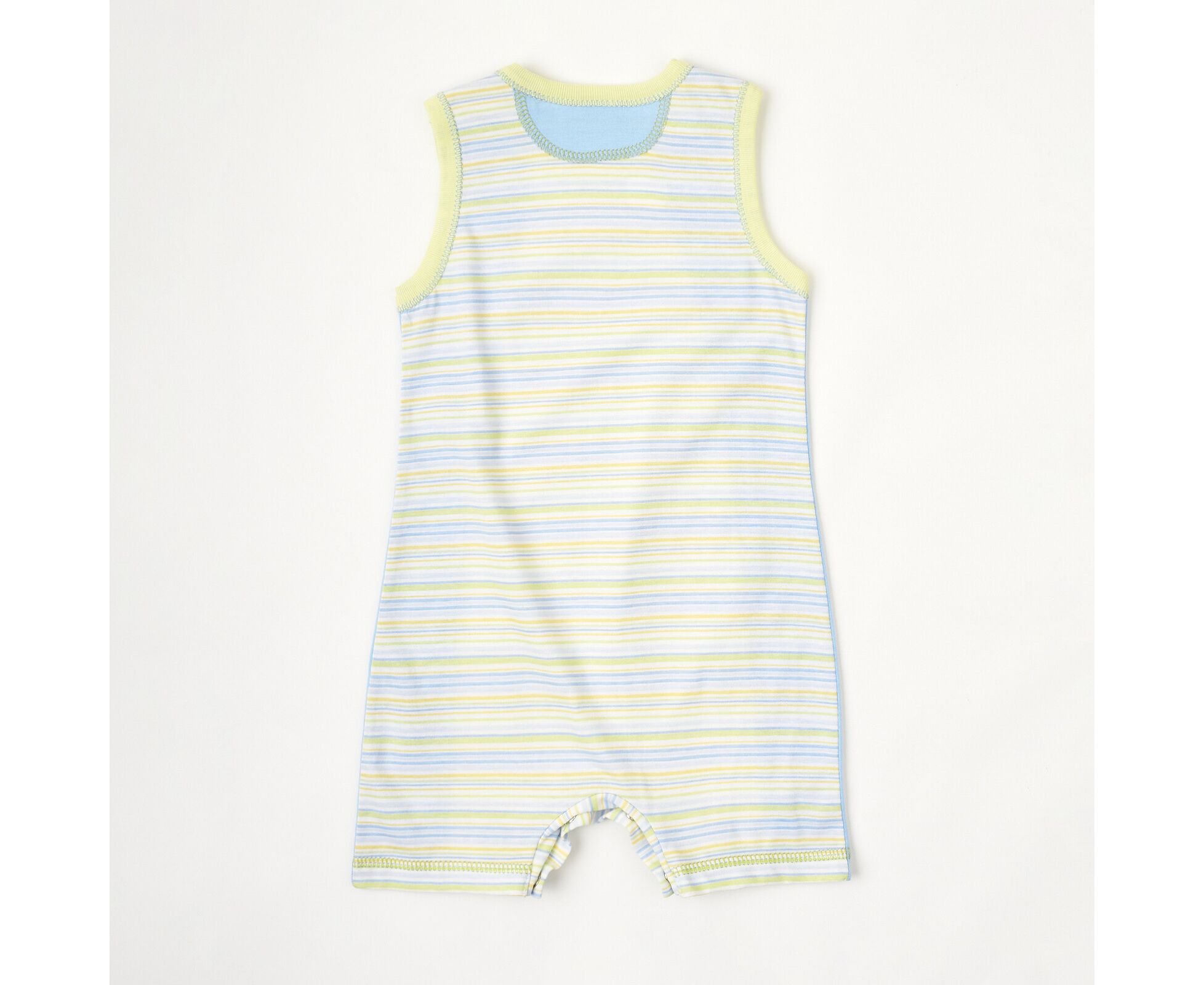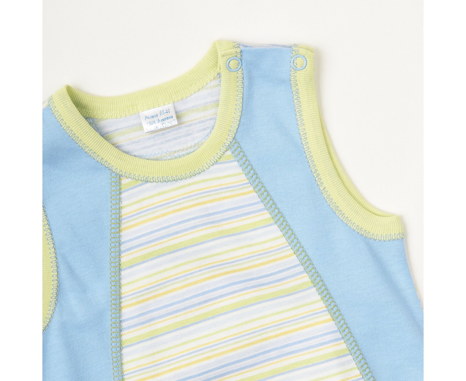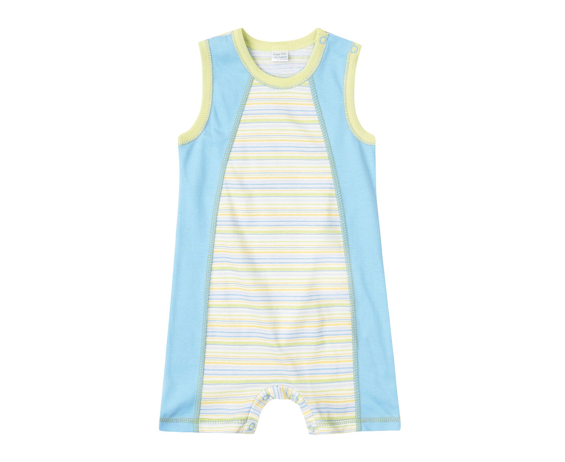 Літній дитячий напівкомбінезон-пісочниця з якісного 100% бавовняного куліру, який добре тримає форму та колір навіть після багаторазового прання. Перед з рельєфами. Застібка на кнопки по плечу. Планочка між ніжками також на кнопочках, що дозволяє при нагоді зручно та швидко замінити памперс. По горловині та проймам окантовка з контрасної бавовняної рібани.