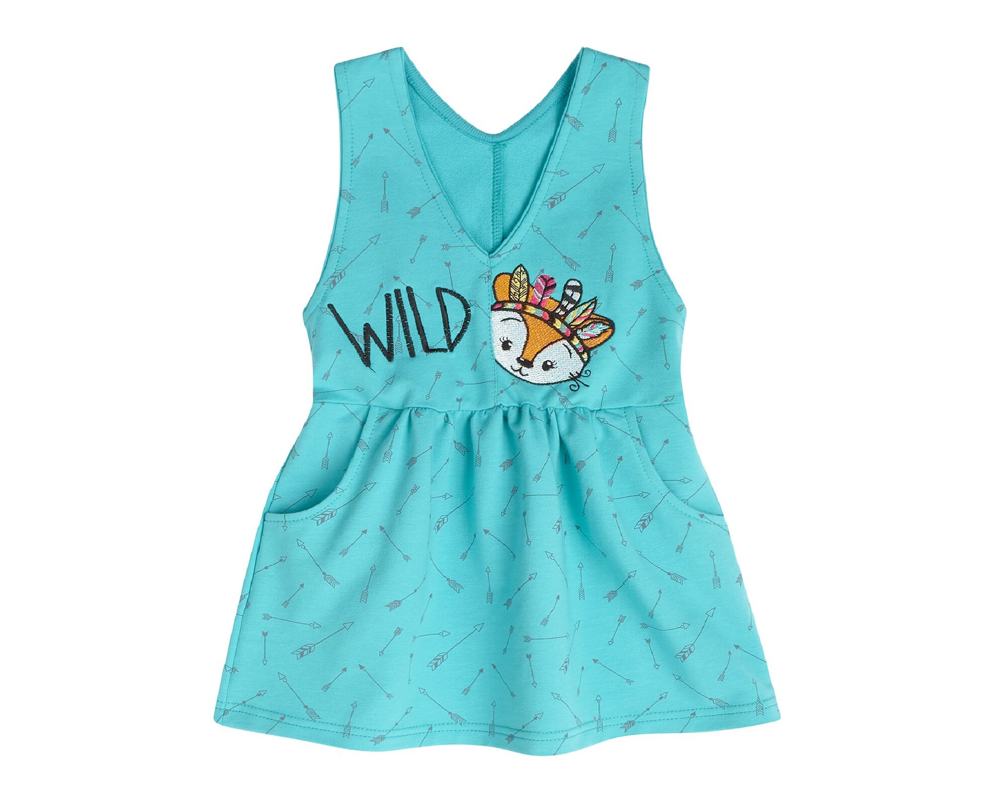 Дитячий сарафан з якісної двонитки, яка добре тримає форму навіть після багаторазового прання. На переді вишивка. Сарафан з еластичною призборкою по лінії таліі, з боковими кишенями на спідниці переда. Горловина та пройми оброблені лампасом з внутрішнього боку.