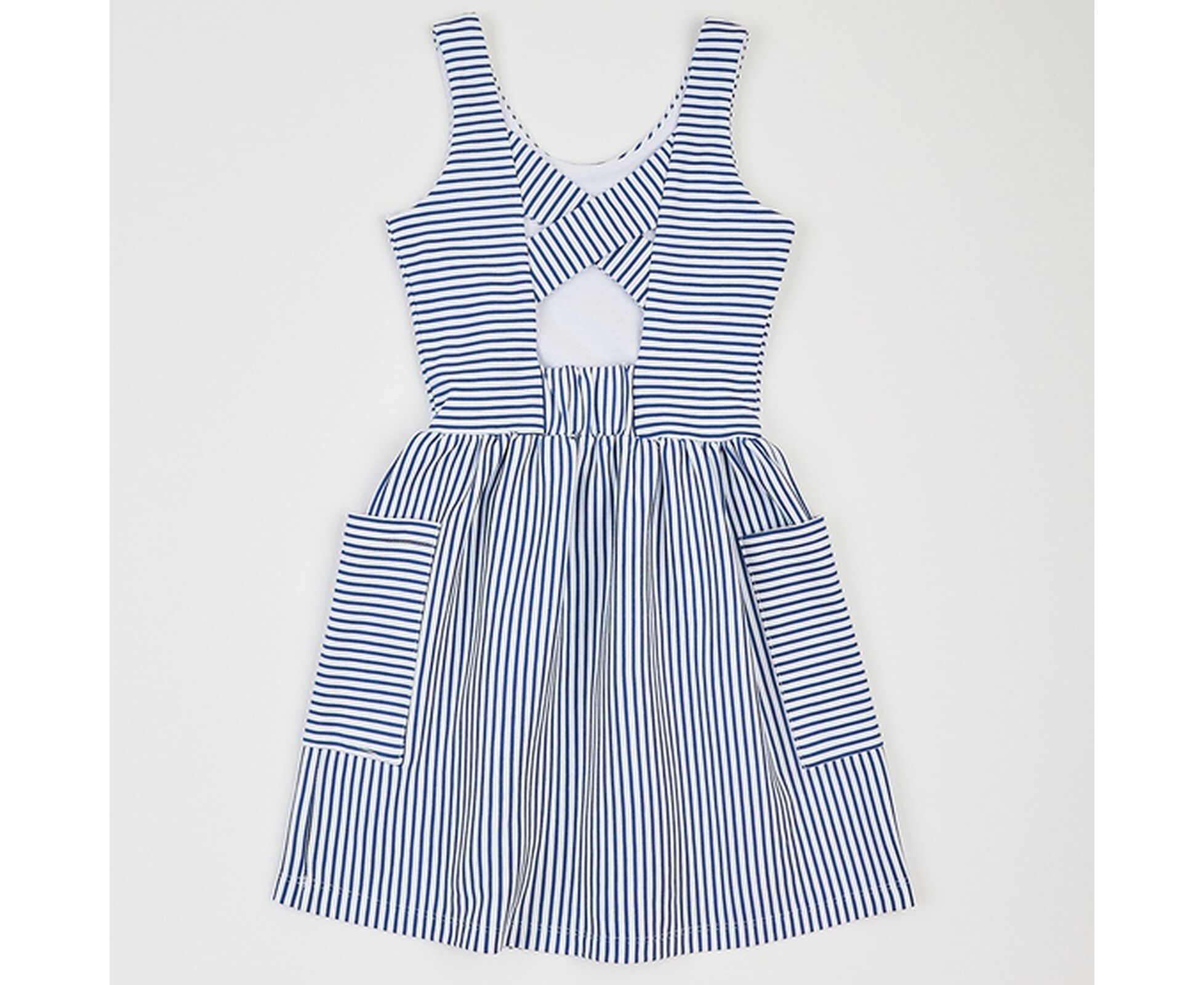 Літній сарафан в синьо-білу полоску з натурального 100%бавовняного тоненького інтерлоку. Великі накладні кишені, призборка по талії та оригінальний виріз на спинці надають виробу стильності та зручності.