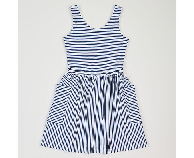 Літній сарафан в синьо-білу полоску з натурального 100%бавовняного тоненького інтерлоку. Великі накладні кишені, призборка по талії та оригінальний виріз на спинці надають виробу стильності та зручності.