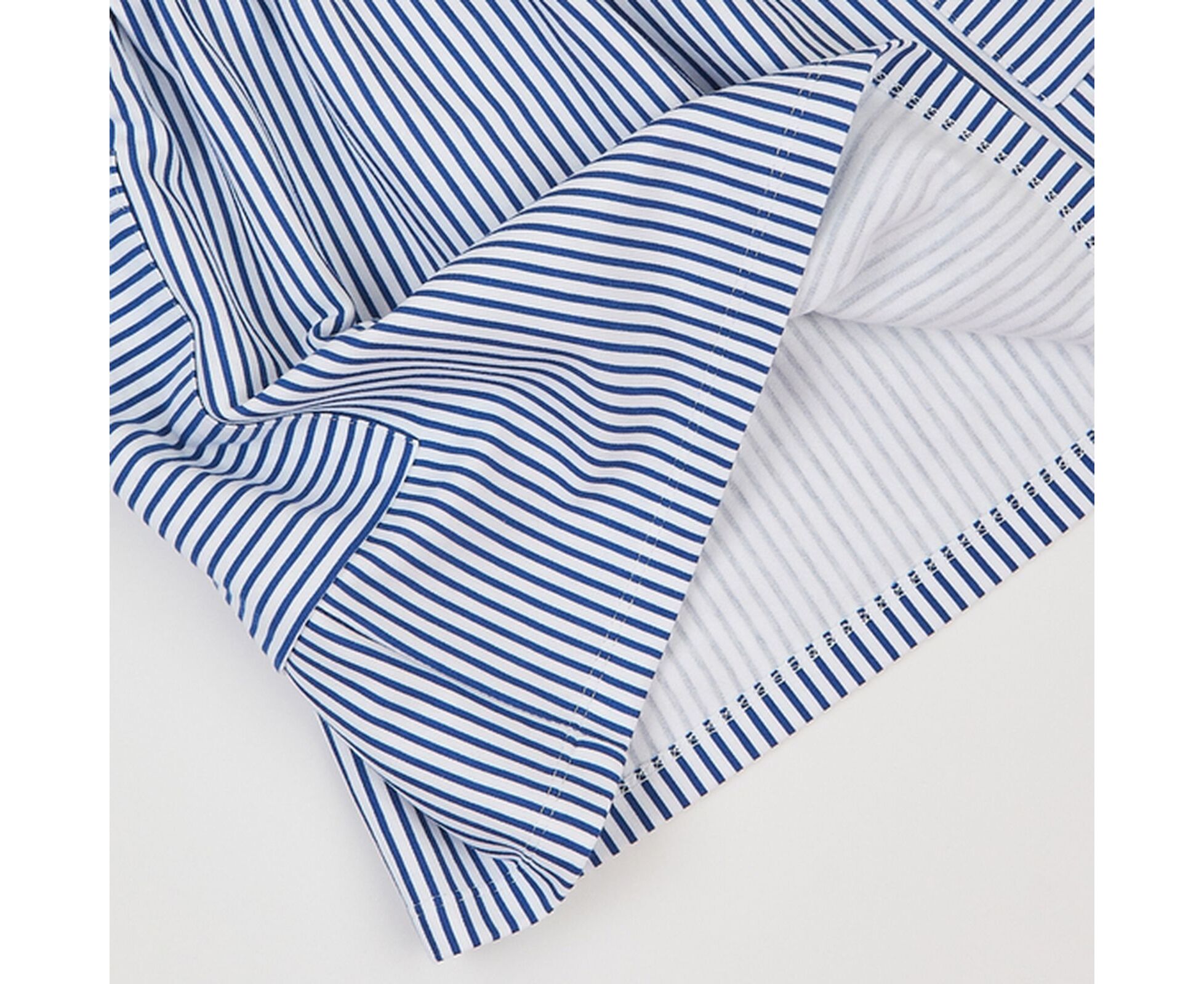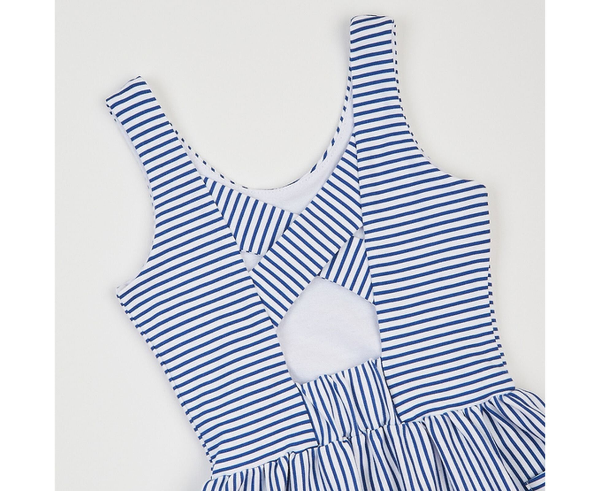 Літній сарафан в синьо-білу полоску з натурального 100%бавовняного тоненького інтерлоку. Великі накладні кишені, призборка по талії та оригінальний виріз на спинці надають виробу стильності та зручності.