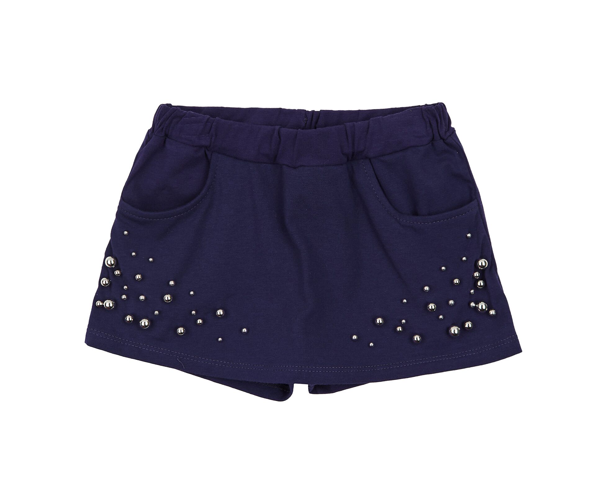 Шорти-спідниця з з якісного стрейч-куліру (97%бавовона 3%еластан). Передні половинки вкриті полотнищем спідниці з декором з пришивних сталевих перлинок та обробленими боковими кишенями. Пояс пришивний, з основного полотна, з вложеною всередині резинкою.