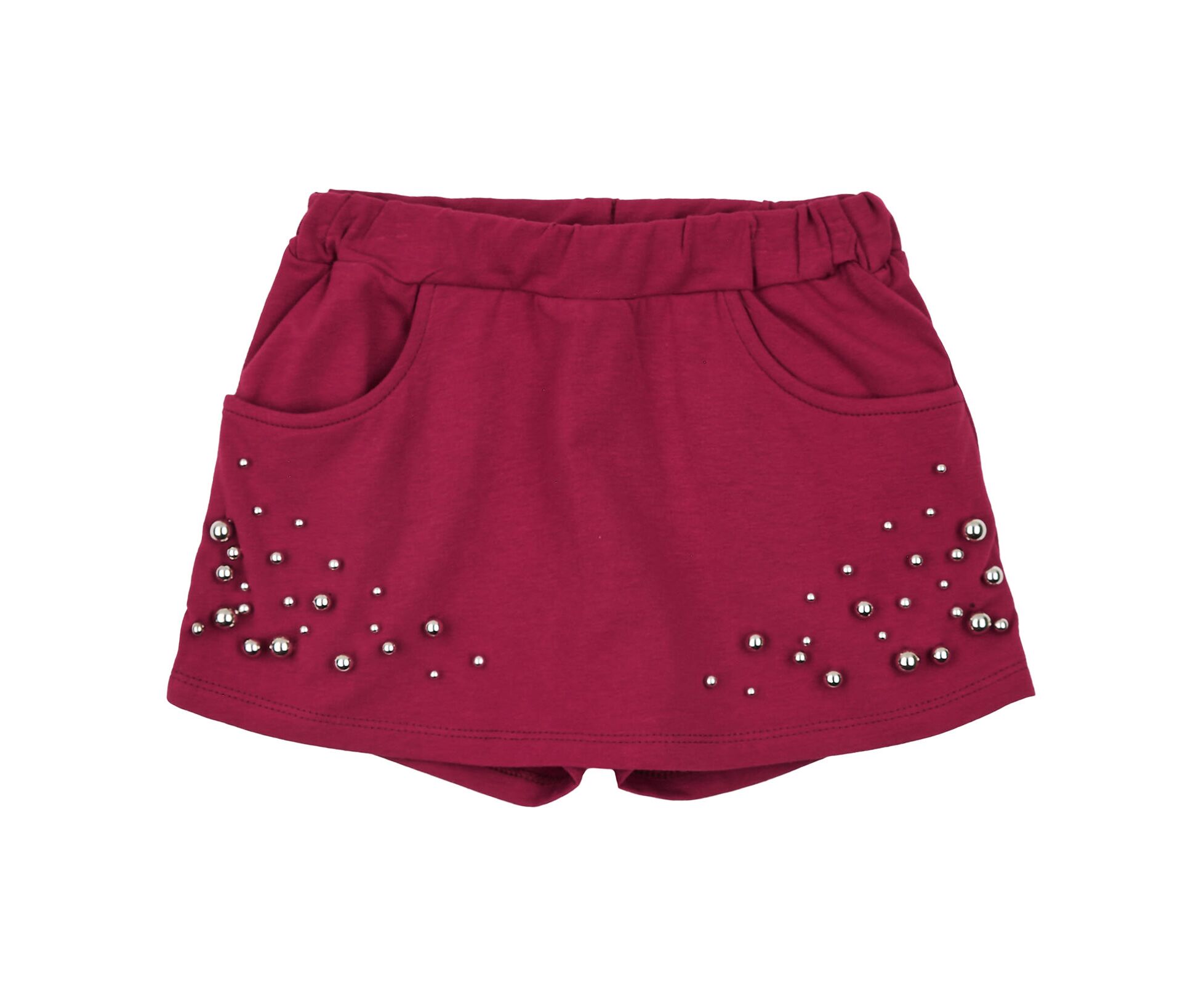 Шорти-спідниця з з якісного стрейч-куліру (97%бавовона 3%еластан). Передні половинки вкриті полотнищем спідниці з декором з пришивних сталевих перлинок та обробленими боковими кишенями. Пояс пришивний, з основного полотна, з вложеною всередині резинкою.