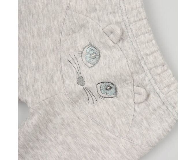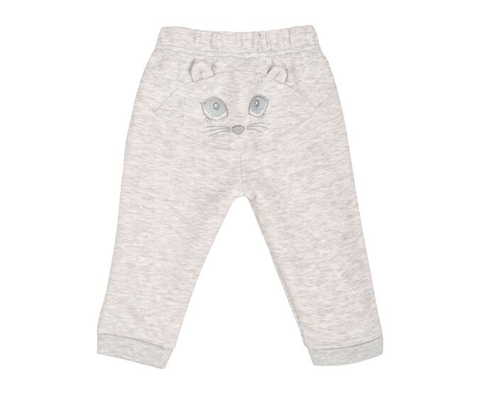 Дитячі штанці з приємного м'якого меланжевого капітону (тришарова тканина з тоненьким утеплювачем всередині). Ззаду штанців фігурна кокетка з кумедною вишивкою морди мишеняти,та з відлітними деталями, імітуючими вушка. Пояс цільнокроєний з продівною резинкою, по низкам штанів - манжети з еластичного полотна.