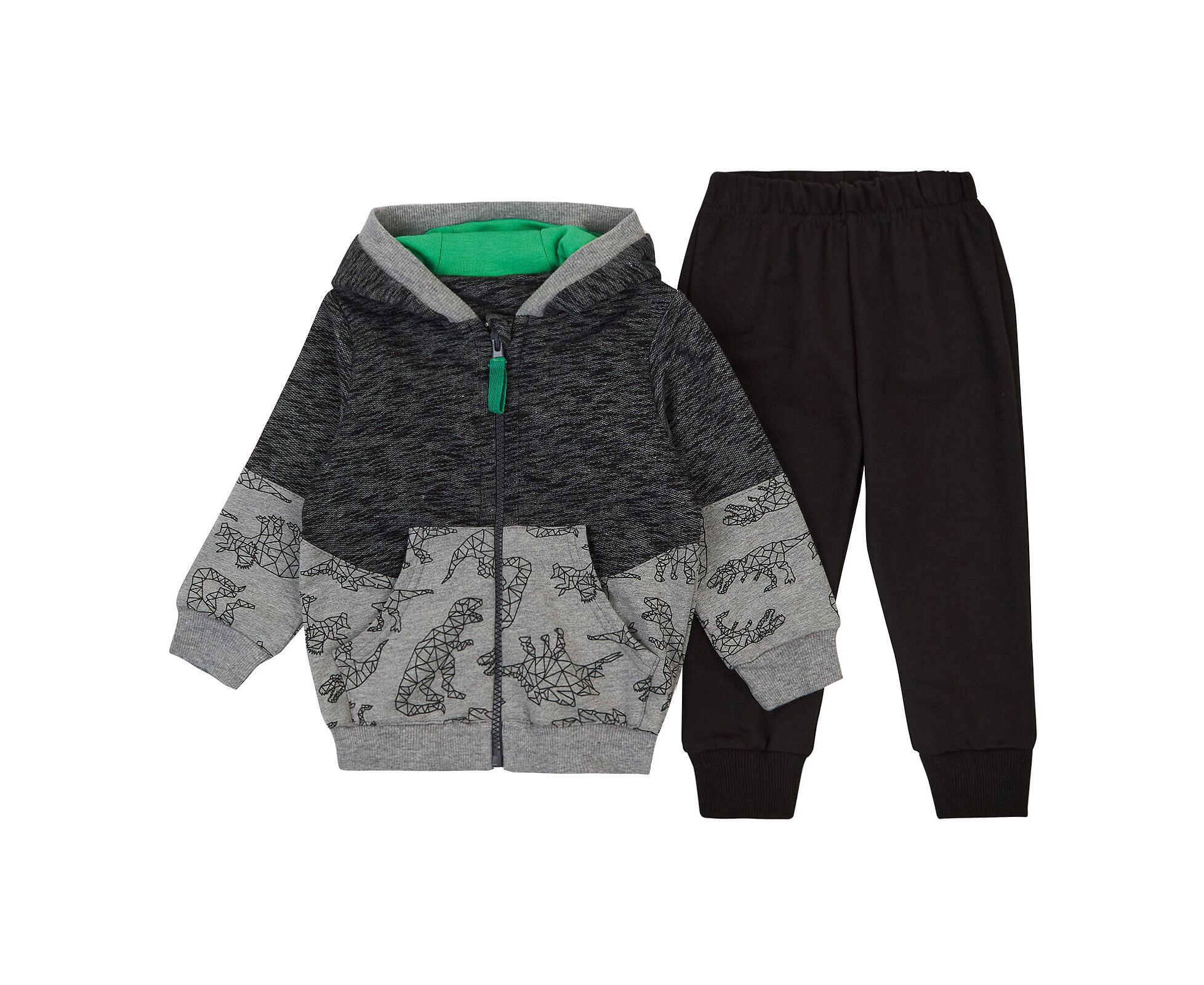 Дитячий костюм з кофти з капюшоном та штанів. Виготовлений з дуже якісної двонитки з принтом в поєднанні з меланжевою двониткою. Капюшон кофти повністю на бавовняній підкладці контрасного кольору. Кокетки по пілочкам,спинці та рукавам візуально створюють одну лінію, надаючи виробу гармонії та стилю. Кофта з кишенями-кенгуру на пілочках та з центральною застібкою на якісну блискавку. Планка капюшона, пояс по низу кофти та манжети рукавів з еластичного полотна. Штани з чорної якісної двонитки . Пояс та манжети по низкам штанів з фактурного еластичного полотна. В пояс продіта еластична гумка.