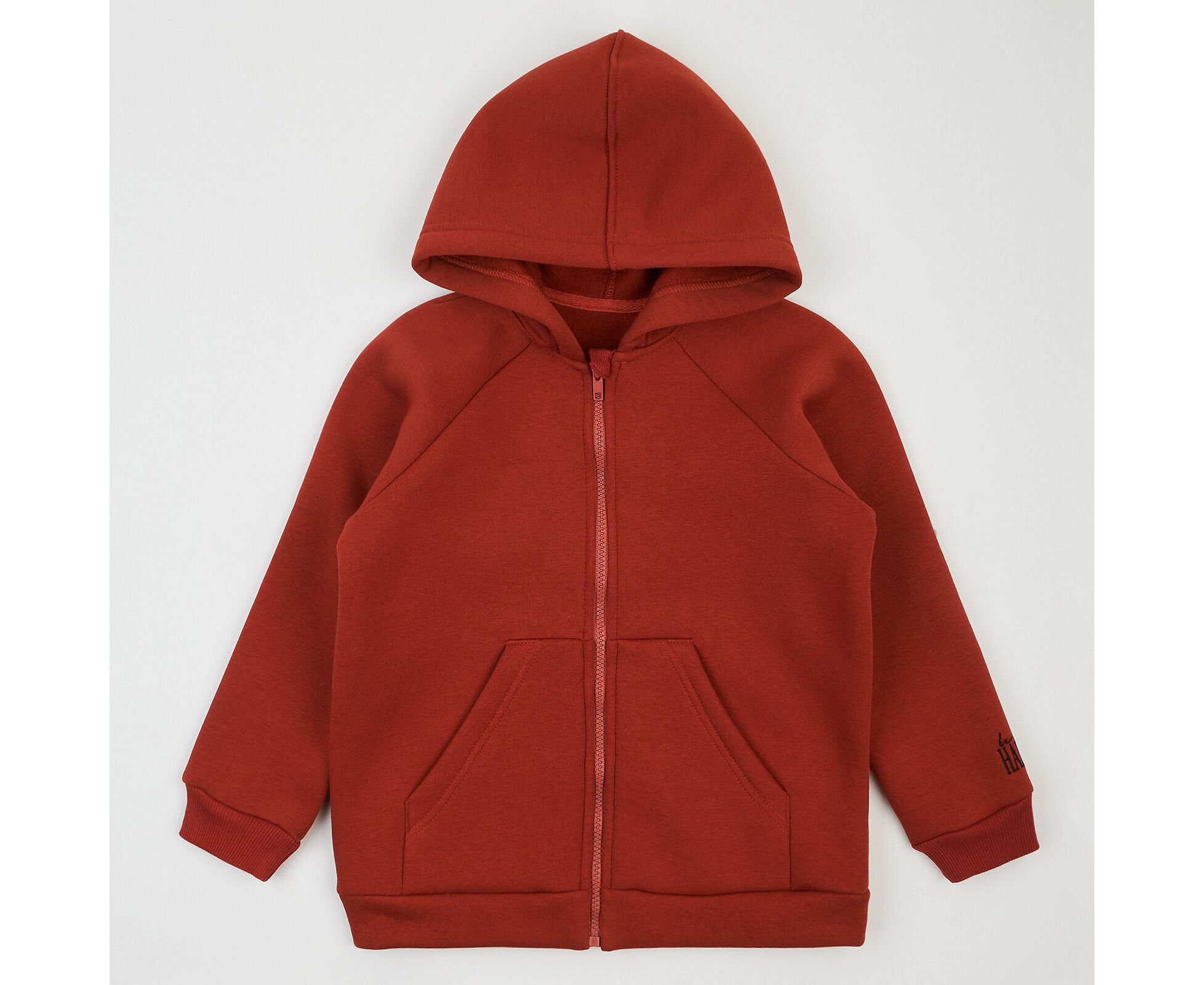 Стильний костюм з теплої, з приємним на дотик начосом всередині, трьохнитки. Кофта з каптуром, з кишенею-кенгурушкою На рукаві невеличка вишивка. Центральна застібка на блискавку-трактор, шви горловини та блискавки зсередини закриті бавовняною оздоблювальною тасьмою. По низу рукавів кофти та по низкам штанів - манжети з еластичного фактурного полотна.