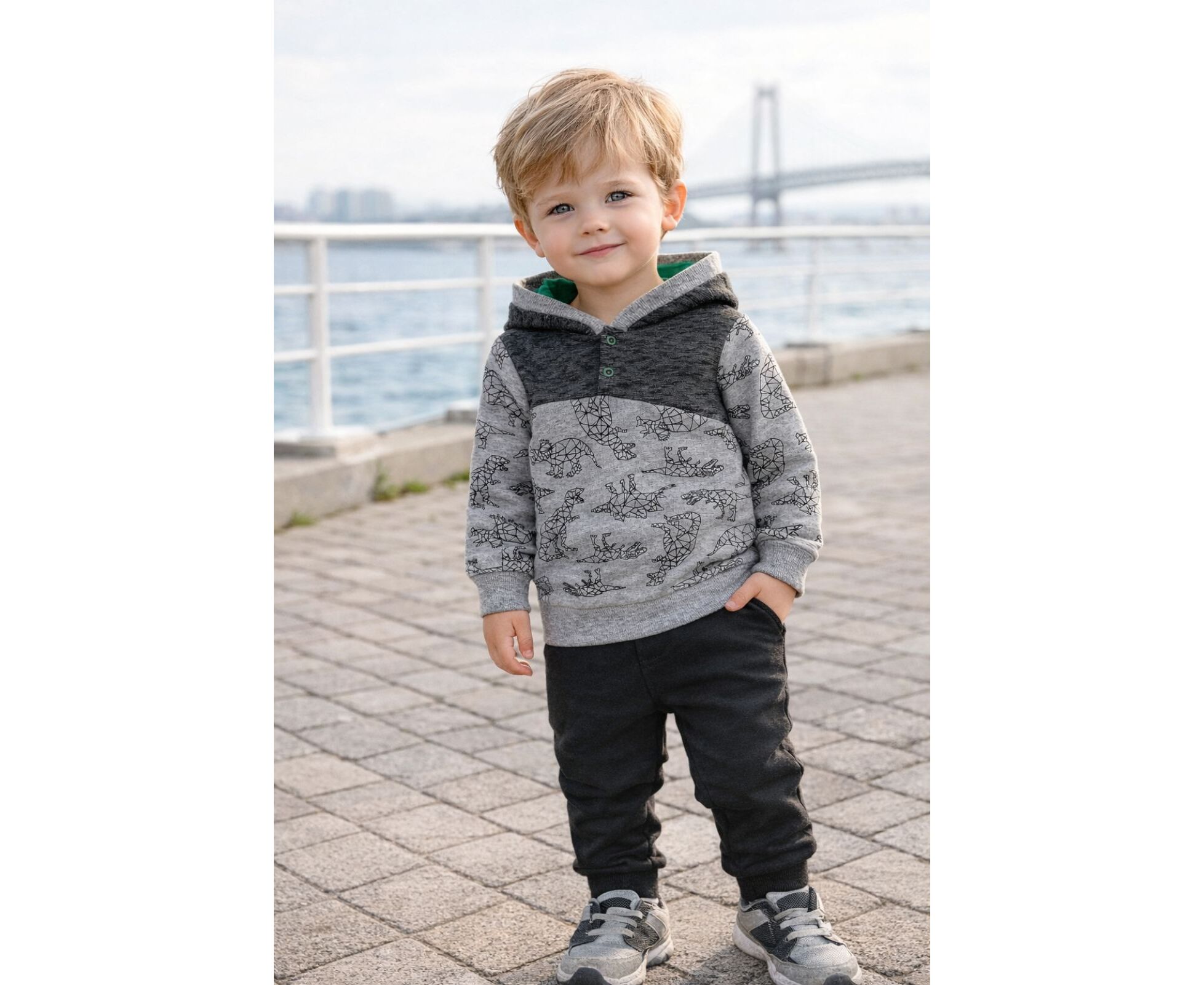 Дитячий худі з капюшоном з дуже якісної двонитки з принтом. Капюшон повністю на бавовняній підкладці контрасного кольору. Перед та спинка з кокеткою , по центру кокетки переда застібка на дві кнопки. Планка капюшона, пояс по низу світшоту та манжети рукавів з еластичного полотна.