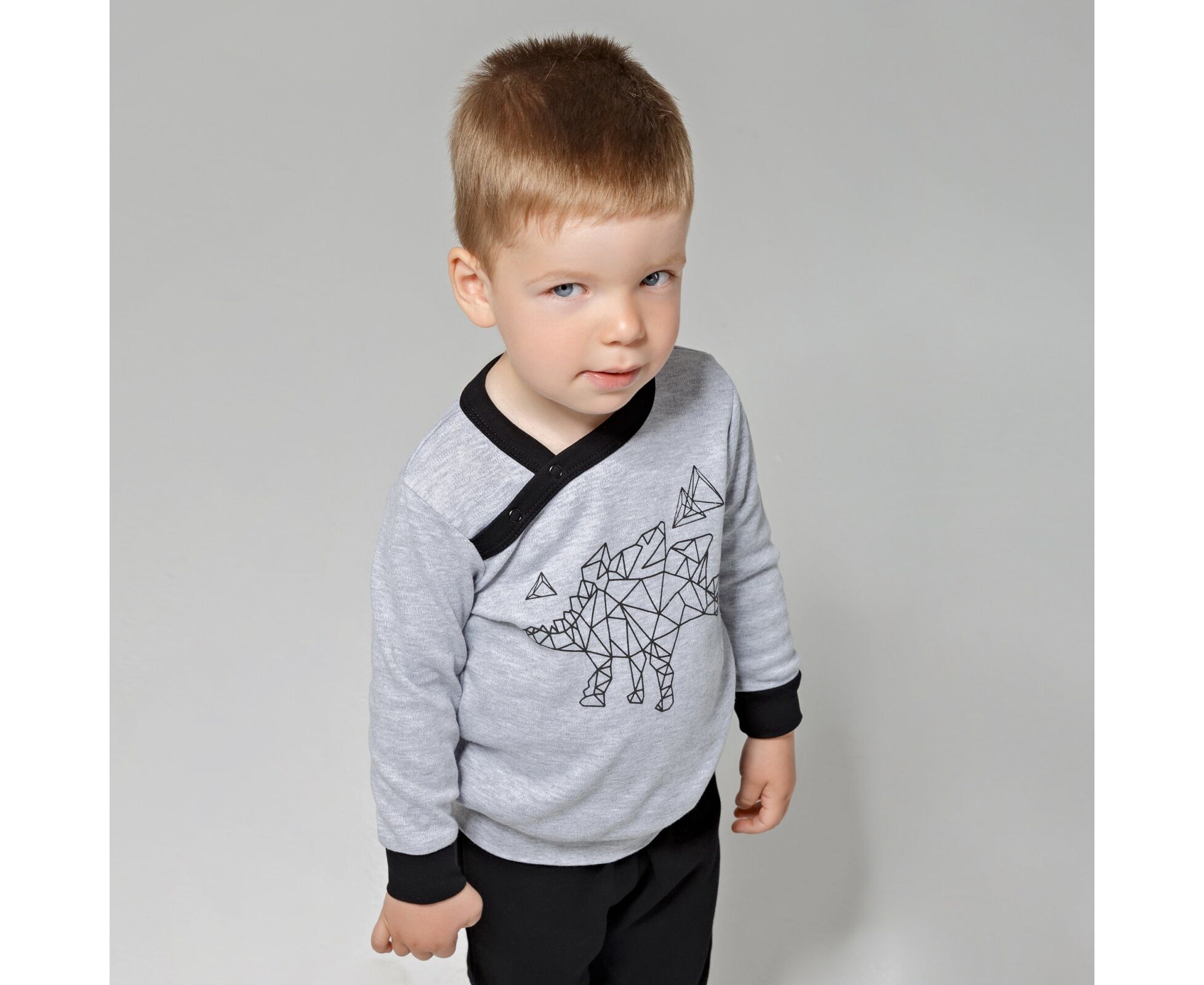 Стильний дитячий світшот вільного силуету з асиметричною горловиною та застібкою на кнопки. Світшот виготовлений з меланжевого інтерлока преміум якості. На переді світшоту декоративниі принт. По низу рукавів та низу виробу манжети з еластичної рібани.
