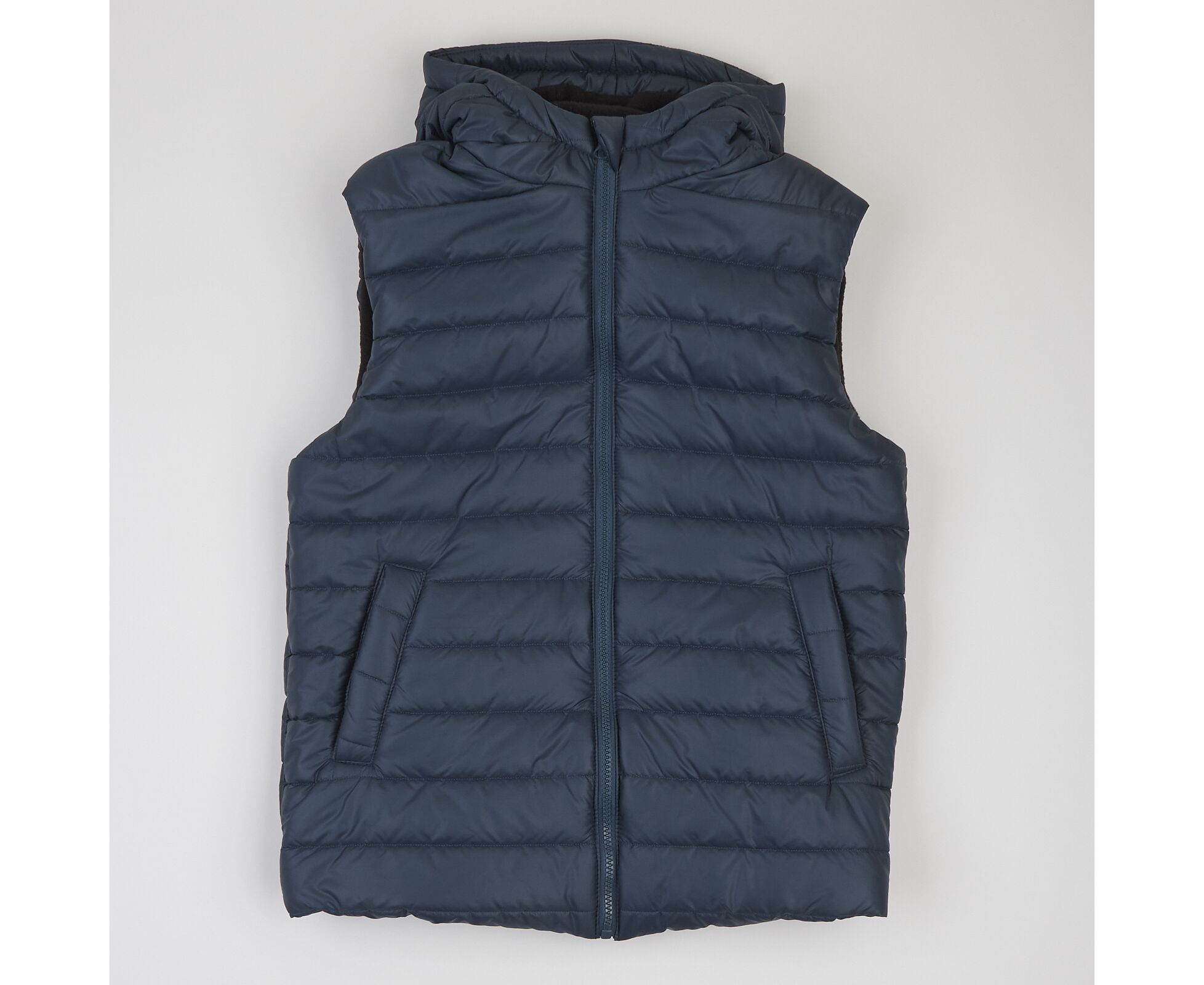 Зручний в прохолодну погоду жилет з каптуром та високою стійкою, з простьобаної плащовки лаке, на дуже приємному на дотик м'якенькому флісі ,з утеплювачем синтепух щільністю 150г/кв.м., який добре зберігає форму та об'єм, навіть після багаторазового стиснення. Застібка блискавка центральна , бокові кишені-"листочки" з підзором з флісу, що забезпечує рукам і тепло, і приємний дотик. Присборка на вузеньку резинку по низу спинки запобігає продуванню.