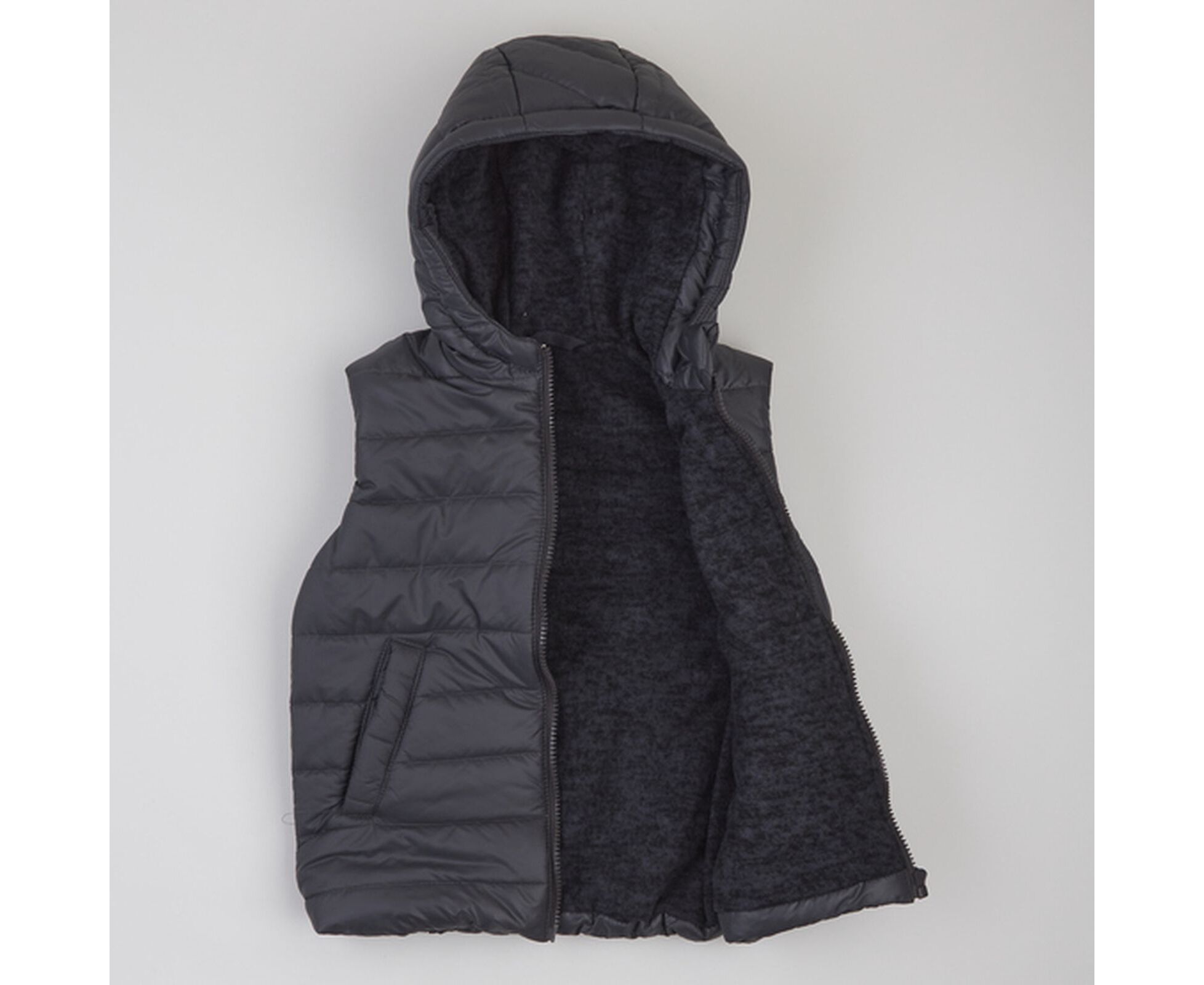 Зручний в прохолодну погоду жилет з каптуром та високою стійкою, з простьобаної плащовки лаке, на дуже приємному на дотик м'якенькому флісі ,з утеплювачем синтепух щільністю 150г/кв.м., який добре зберігає форму та об'єм, навіть після багаторазового стиснення. Застібка блискавка центральна , бокові кишені-"листочки" з підзором з флісу, що забезпечує рукам і тепло, і приємний дотик. Присборка на вузеньку резинку по низу спинки запобігає продуванню.