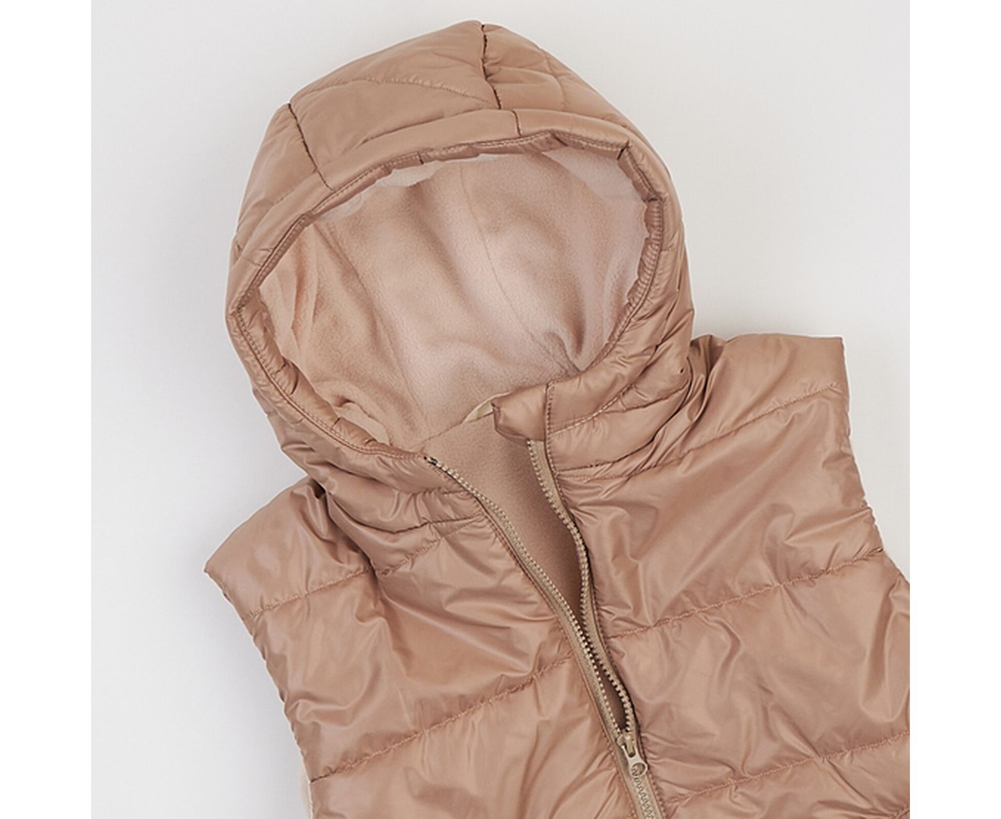 Зручний в прохолодну погоду жилет з каптуром та високою стійкою, з простьобаної плащовки лаке, на дуже приємному на дотик м'якенькому флісі ,з утеплювачем синтепух щільністю 150г/кв.м., який добре зберігає форму та об'єм, навіть після багаторазового стиснення. Застібка блискавка центральна , бокові кишені-"листочки" з підзором з флісу, що забезпечує рукам і тепло, і приємний дотик. Присборка на вузеньку резинку по низу спинки запобігає продуванню.
