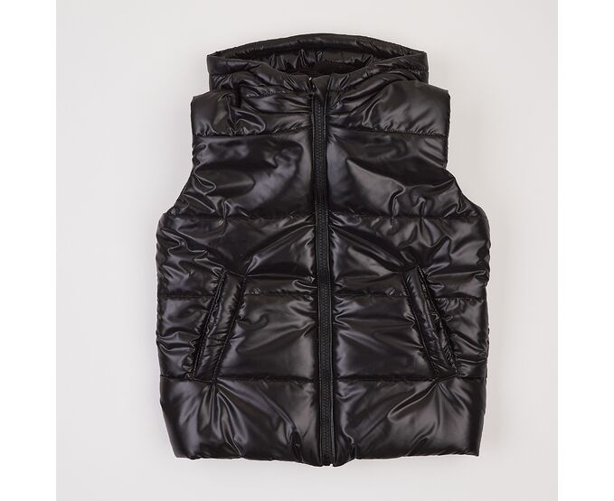 Зручний в прохолодну погоду чорний дитячий жилет з каптуром та високою стійкою, з простьобаної плащовки лаке, на дуже приємному на дотик м'якенькому флісі ,з утеплювачем синтепух щільністю 150г/кв.м., який добре зберігає форму та об'єм, навіть після багаторазового стиснення. Застібка блискавка центральна, бокові кишені-"листочки" з підзором з флісу, що забезпечує рукам і тепло, і приємний дотик. Присборка на вузеньку резинку по низу спинки запобігає продуванню.