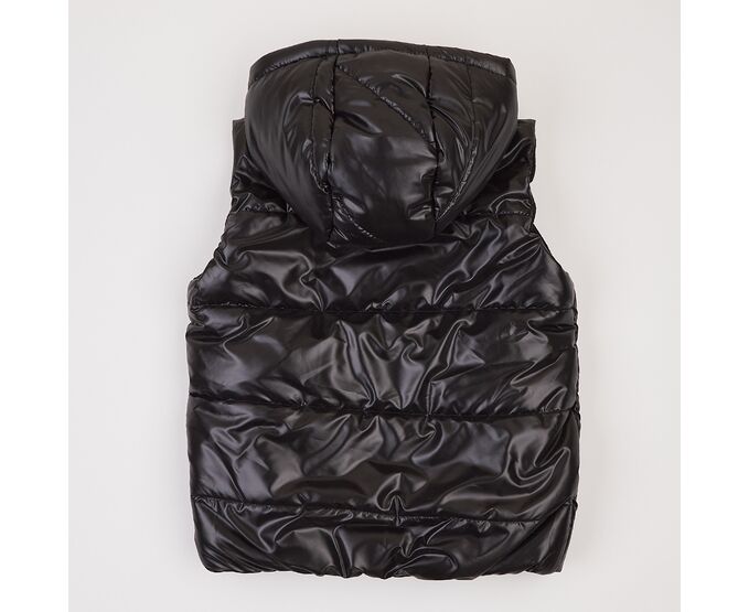 Зручний в прохолодну погоду чорний дитячий жилет з каптуром та високою стійкою, з простьобаної плащовки лаке, на дуже приємному на дотик м'якенькому флісі ,з утеплювачем синтепух щільністю 150г/кв.м., який добре зберігає форму та об'єм, навіть після багаторазового стиснення. Застібка блискавка центральна, бокові кишені-"листочки" з підзором з флісу, що забезпечує рукам і тепло, і приємний дотик. Присборка на вузеньку резинку по низу спинки запобігає продуванню.