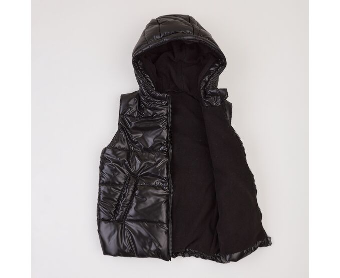 Зручний в прохолодну погоду чорний дитячий жилет з каптуром та високою стійкою, з простьобаної плащовки лаке, на дуже приємному на дотик м'якенькому флісі ,з утеплювачем синтепух щільністю 150г/кв.м., який добре зберігає форму та об'єм, навіть після багаторазового стиснення. Застібка блискавка центральна, бокові кишені-"листочки" з підзором з флісу, що забезпечує рукам і тепло, і приємний дотик. Присборка на вузеньку резинку по низу спинки запобігає продуванню.