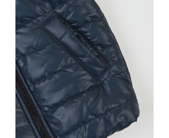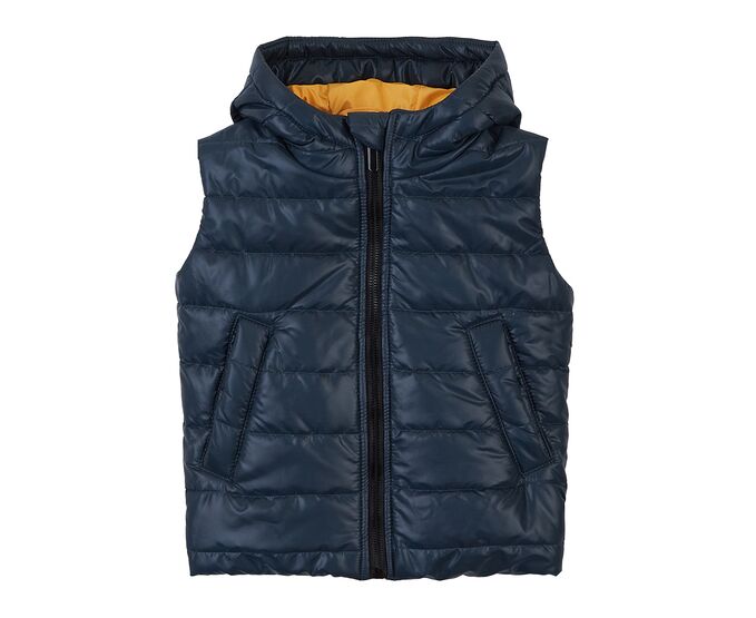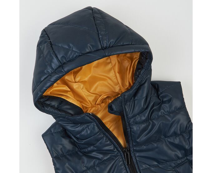 Зручний в прохолодну погоду жилет з каптуром, з простьобаної плащовки лаке, з утеплювачем синтепух щільністю 150г/кв.м., який добре зберігає форму та об'єм, навіть після багаторазового стиснення. Підкладка також з якісної плащовки лаке. Застібка блискавка центральна , бокові кишені-"листочки" . Присборка на вузеньку резинку по низу спинки запобігає продуванню.