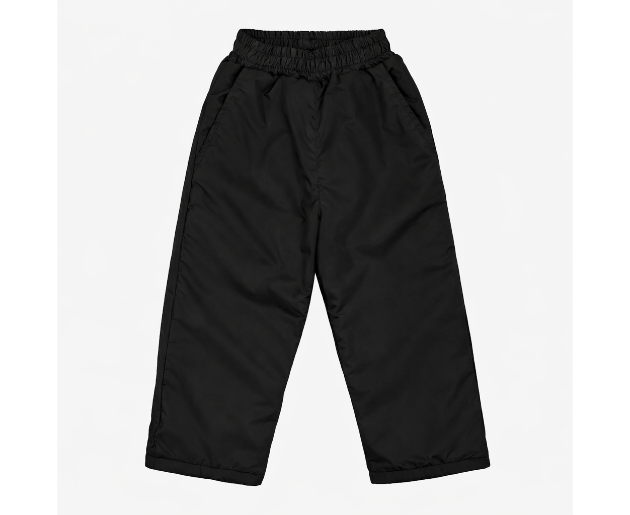Зимові дитячі штани з затяжками по нзкам, з вологонепроникної плащовки. Штани прямого силуету, на підкладці, з м'яким сучасним утеплювачем слімтекс (щільність 200г/кв.м.), який, не дивлячись на те,що на вигляд тоненький, має кращі теплозахисні властивості, ніж синтепон, добре зберігає тепло навіть в сильні морози та дуже зручний в експлуатаціі - завдяки невеликому об'єму не зковує рухи дитини. Задні половинки зверху до колін додатково утеплені підкладкою з приємного на дотик та якісного теплого мікрофлісу, Штани з боковими кишенями. Гумка по поясу закріплена кількома паралельними строчками. Низки штанів стягуються резинкою, кінці якої продіті в люверси та фіксатор.